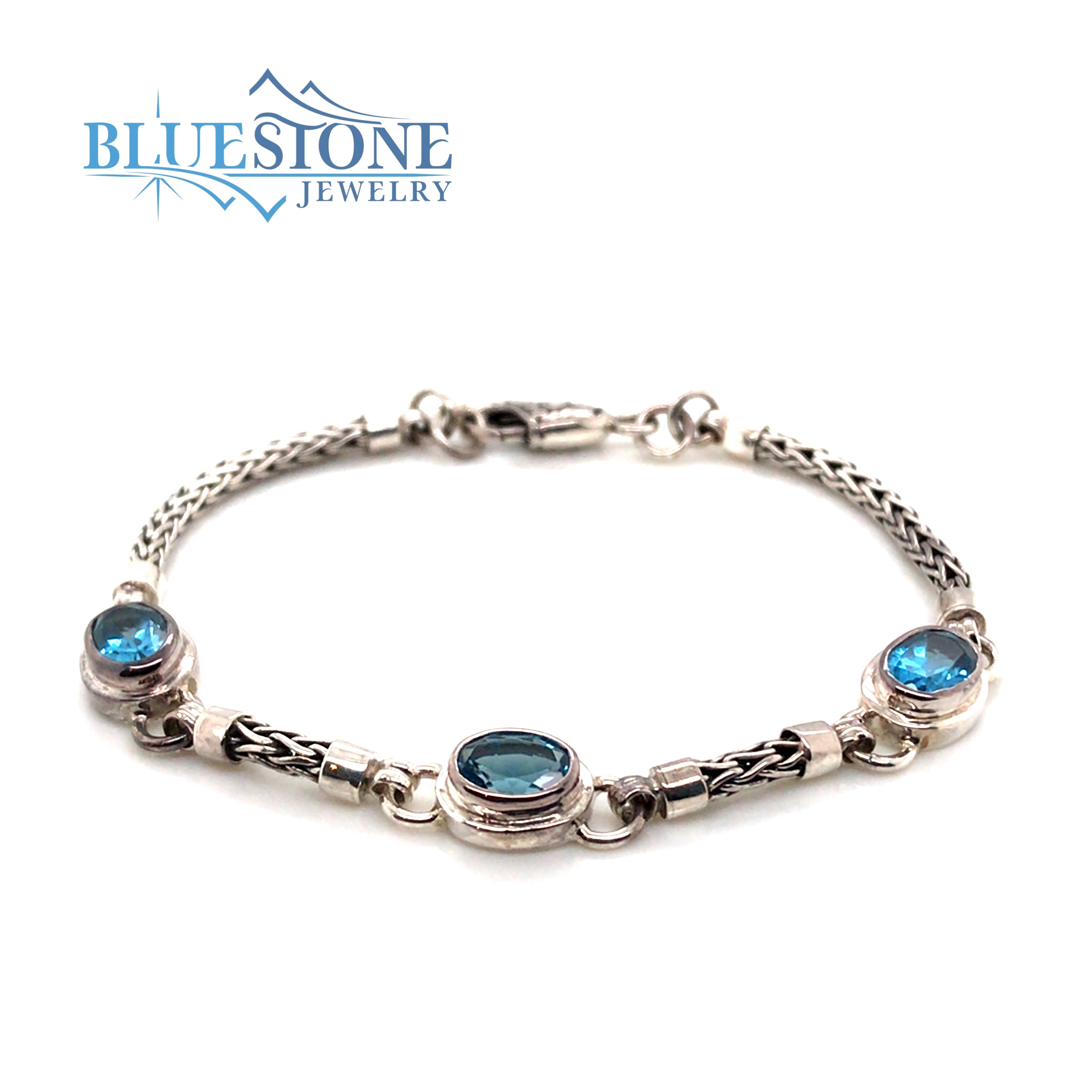 Sterling Silver Handwoven Bracelet with Oval Cut Swiss Blue Topazes. Topazes Measure Approximately 5mm x 7mm. Measures 7.5 Inches in Length.Local Lake Tahoe Bracelet.