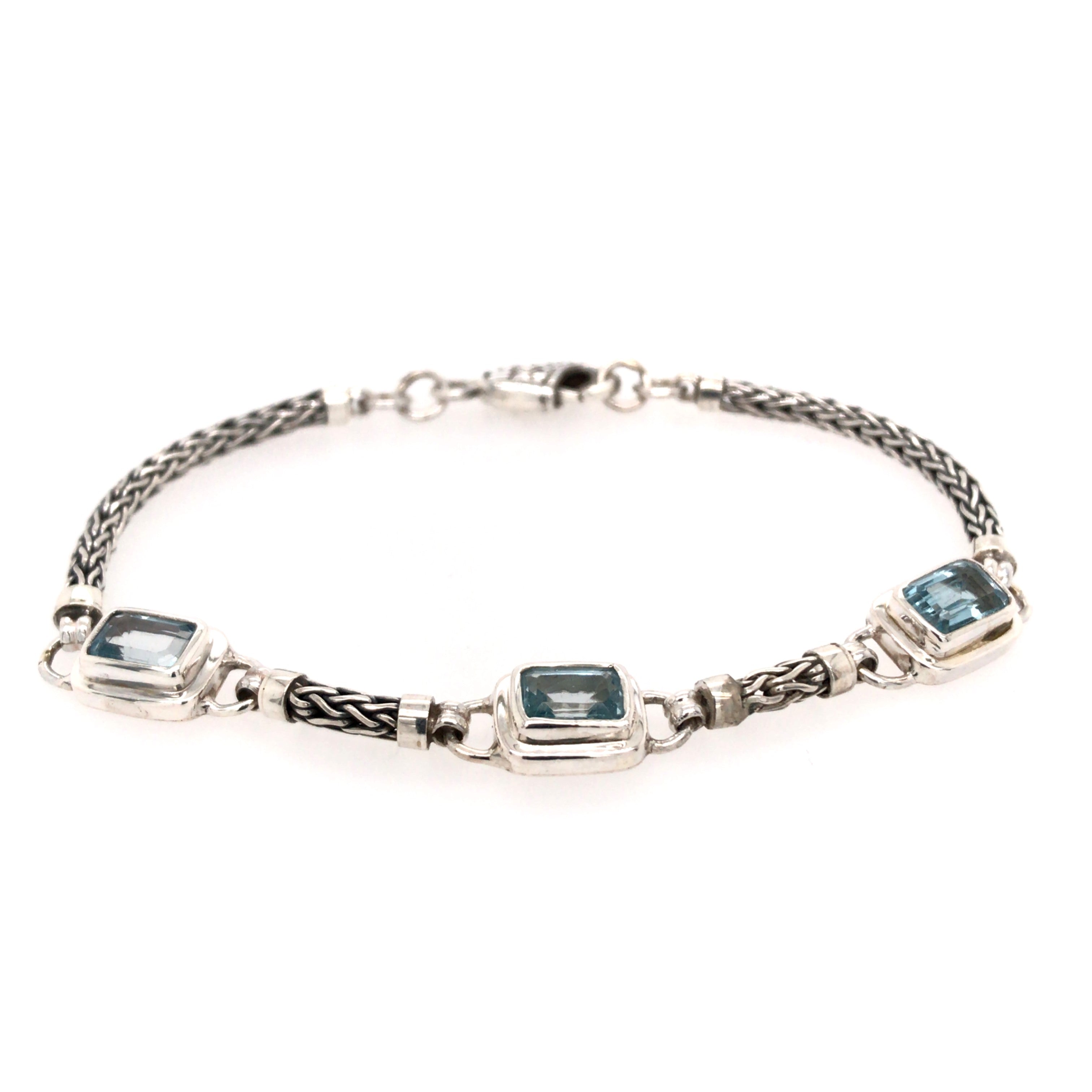 Sterling Silver Handwoven Bracelet with Three Emerald Cut Blue Topazes. Blue Topazes Measure Approximately 5mm x 7mm. Measures 7 Inches in Length.Local Lake Tahoe Bracelet.