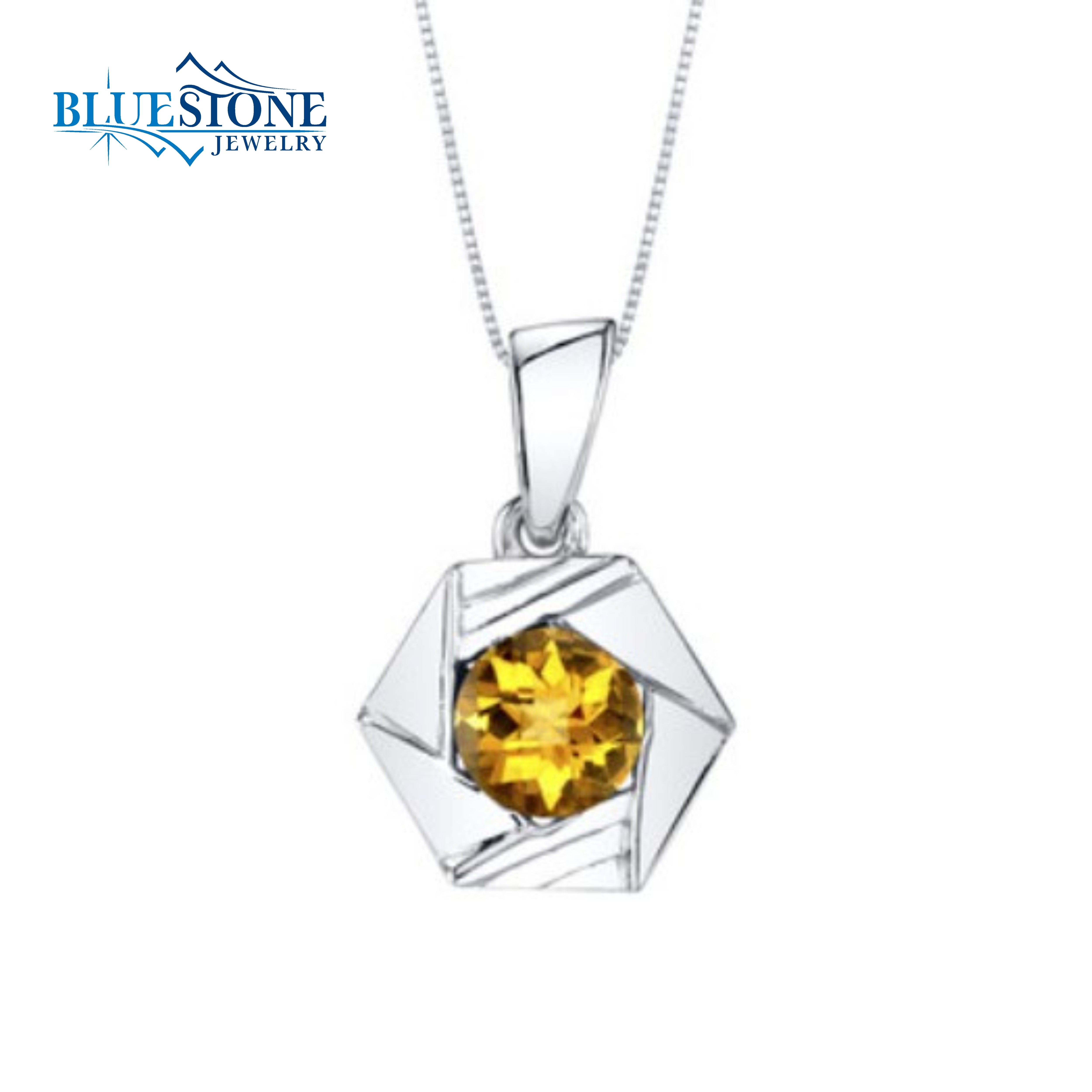 Sterling Silver Rhodium Plated Pendant with One 6mm x 6mm 0.75 Carat Round Cut Genuine Citrine. Pendant Measures 3/4 Long. Comes on a Sterling Silver Rhodium Plated 16 Inch 1mm Box Chain.