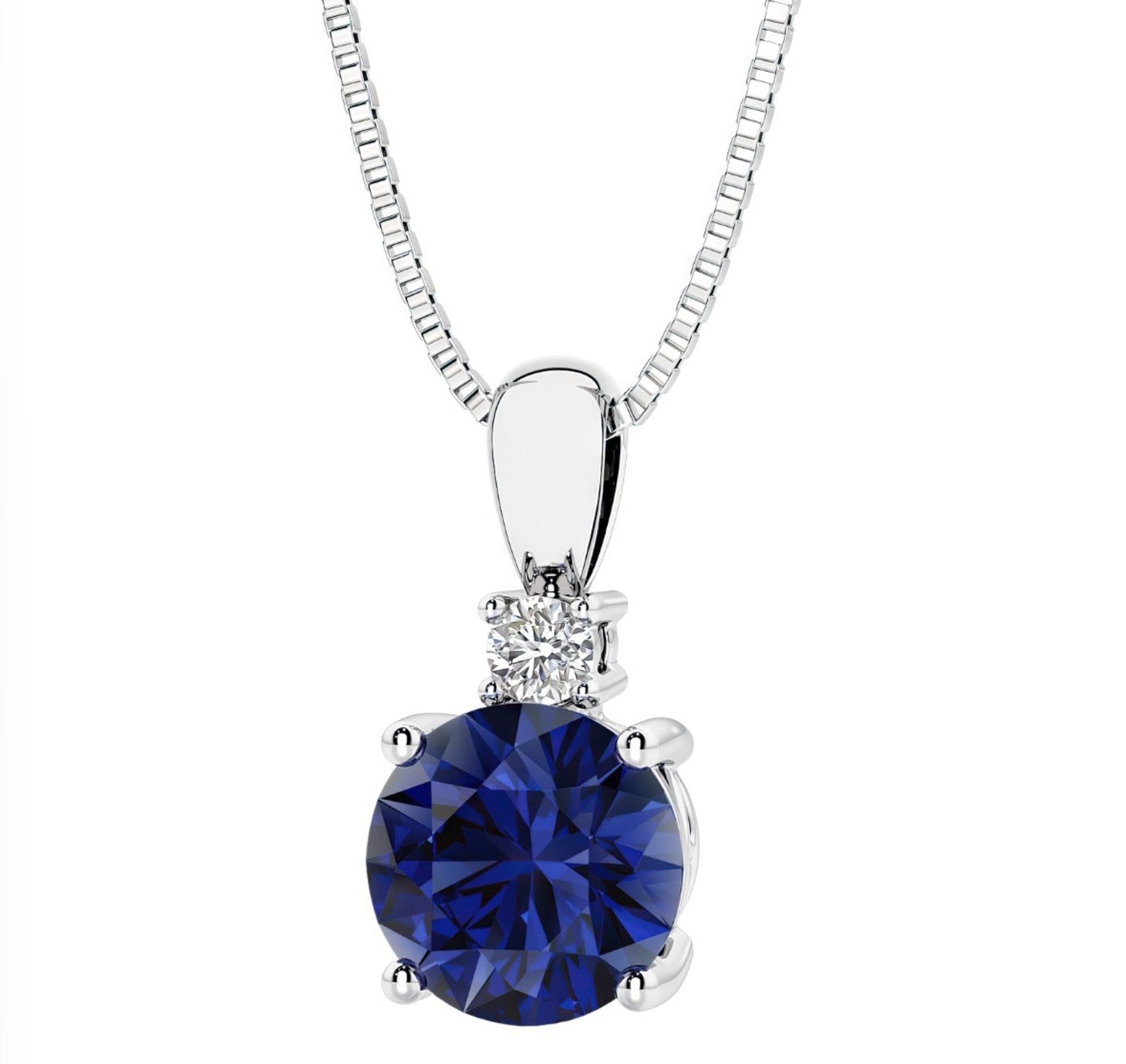 Sterling Silver and Rhodium Plated Solitaire Pendant with One 7mm Round Cut Simulated Blue Sapphire and One 2.4mm Round Lab Grown Diamond. Pendant Comes on an 18" Inch Box Chain. Pendant Measures 5mm Long.