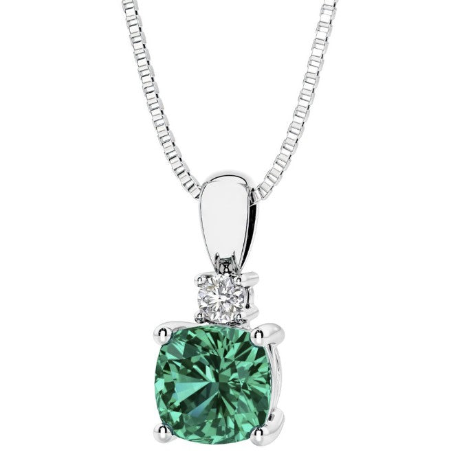 Sterling Silver and Rhodium Plated Solitaire Pendant with One 6mm x 6mm Square Cushion Cut Simulated Emerald Gemstone and One 2.4mm Round Lab Grown Diamond. Pendant Comes on an 18" Inch Box Chain. Pendant Measures 4.4mm.