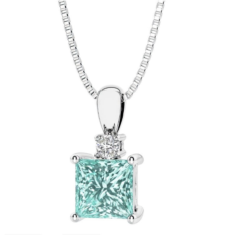 Sterling Silver and Rhodium Plated Solitaire Pendant with One 6mm x 6mm Princess Cut Simulated Tourmaline and One 2.4mm Round Lab Grown Diamond. Pendant Comes on an 16" Inch Box Chain. Pendant Measures 4.8mm.