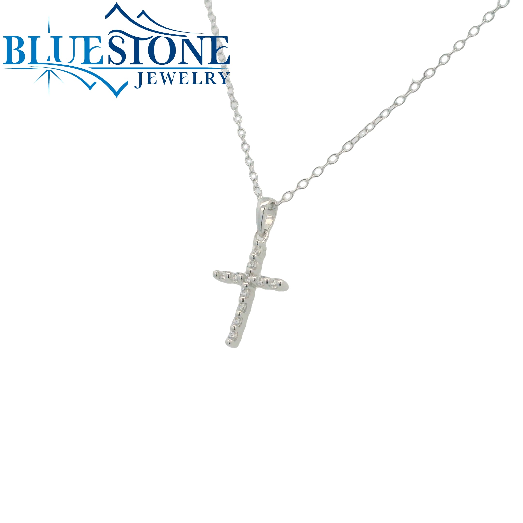 Sterling Silver Rhodium Plated Cross Necklace With 11 Cubic Zirconia Gemstones For Extra Sparkle.Necklace Length Is 16.5".