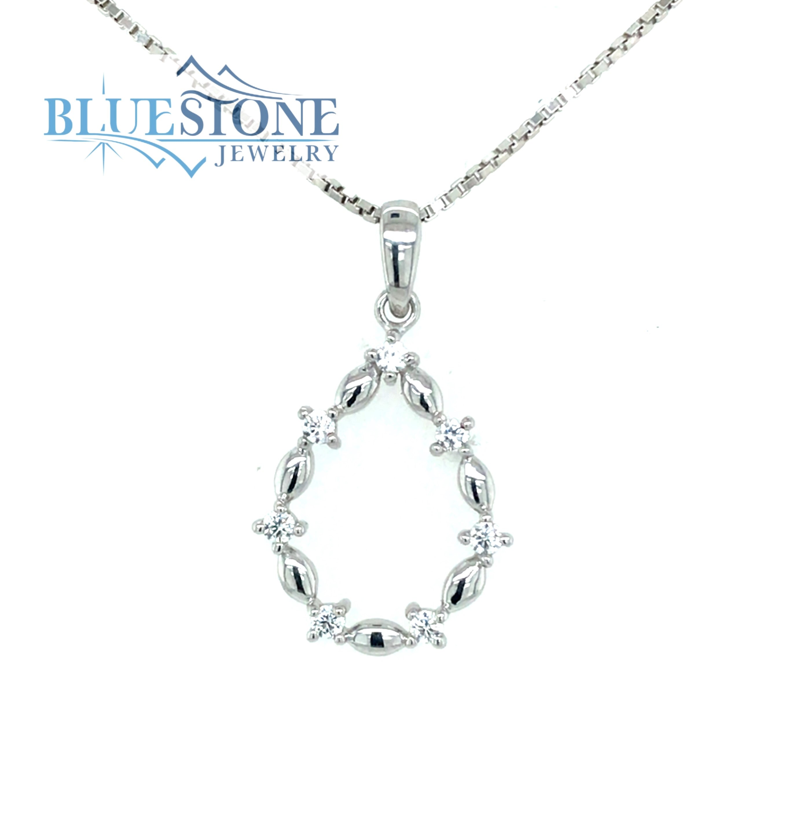 Sterling Silver Rhodium Plated Pendant with 7 Round Cubic Zirconias. Pendant Measures 1 Inch Long. Comes on a Sterling Silver Rhodium Plated 16 Inch 1mm Box Chain.