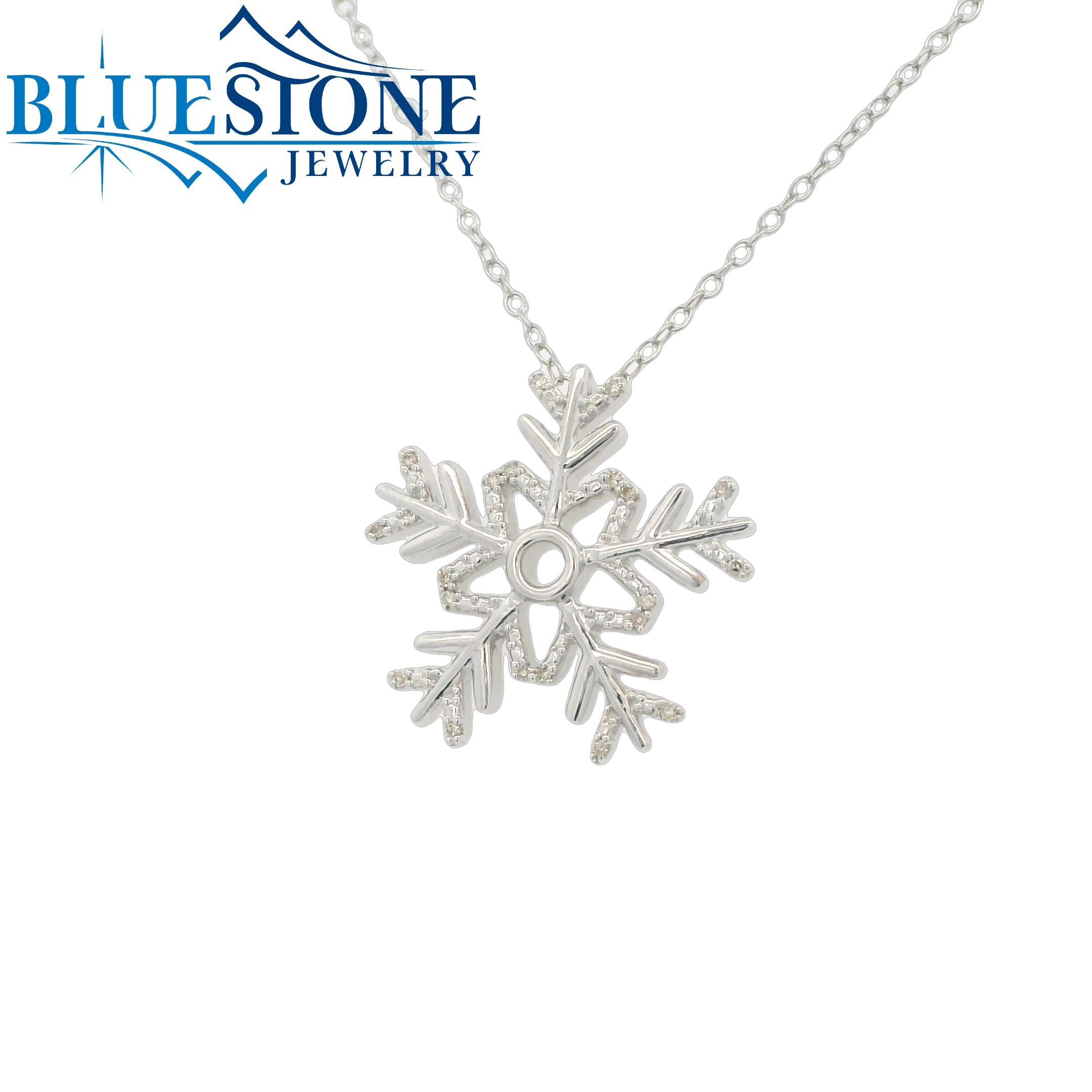 Sterling Silver Snowflake Pendant with 20 Round Diamonds at 0.08 carats total weight.Come on a Sterling Silver 18 Inch Rolo Chain. Pendant measures approximately 7/8" wide.