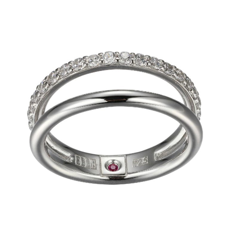 Sterling Silver and Rhodium Plated Double Band Ring with One Band of Cubic Zirconias and One Solid Silver Band. Ring Includes One Hidden Round Created Ruby Which Represents Inner Beauty, Inner Peace & Inner Strength. Ring Size 9.
