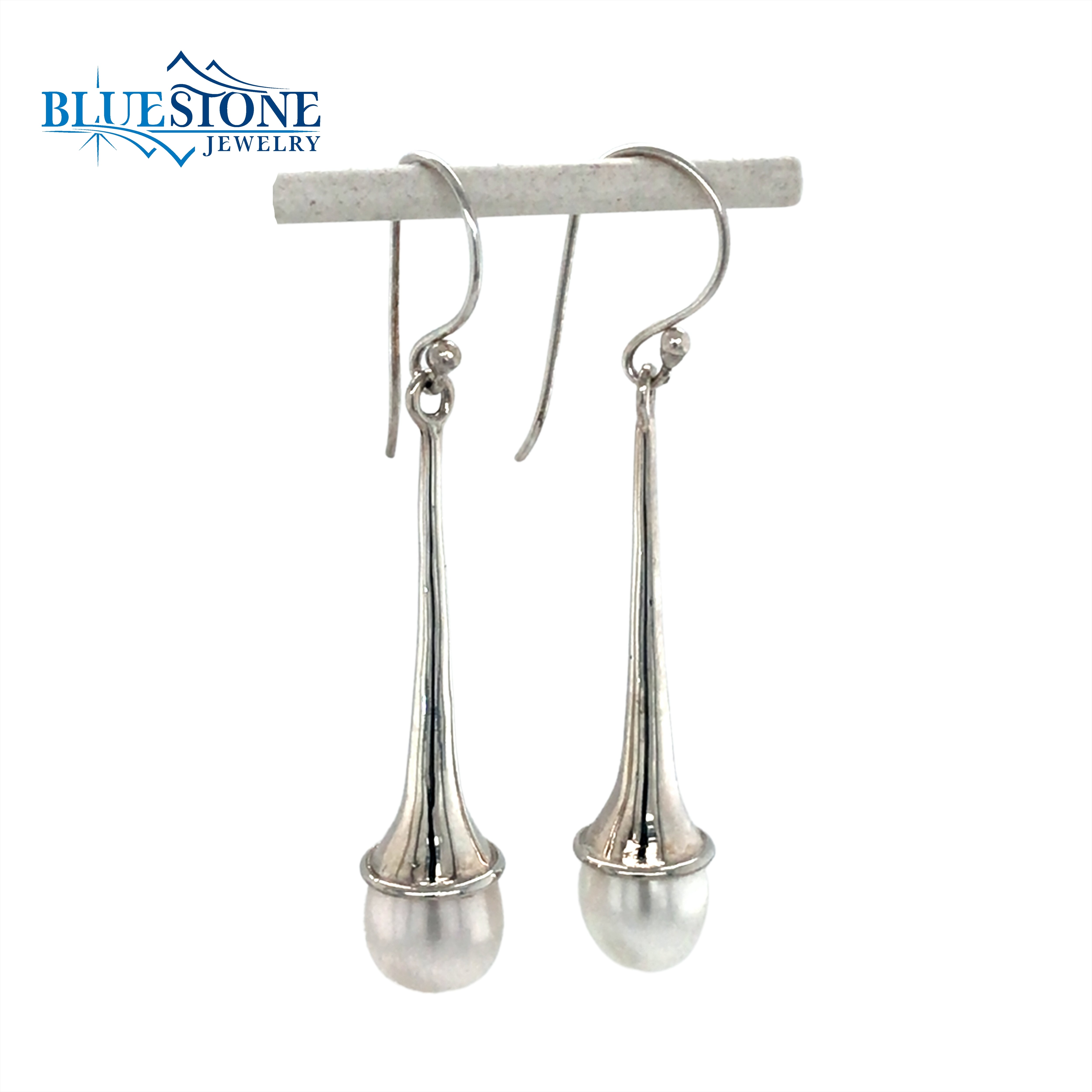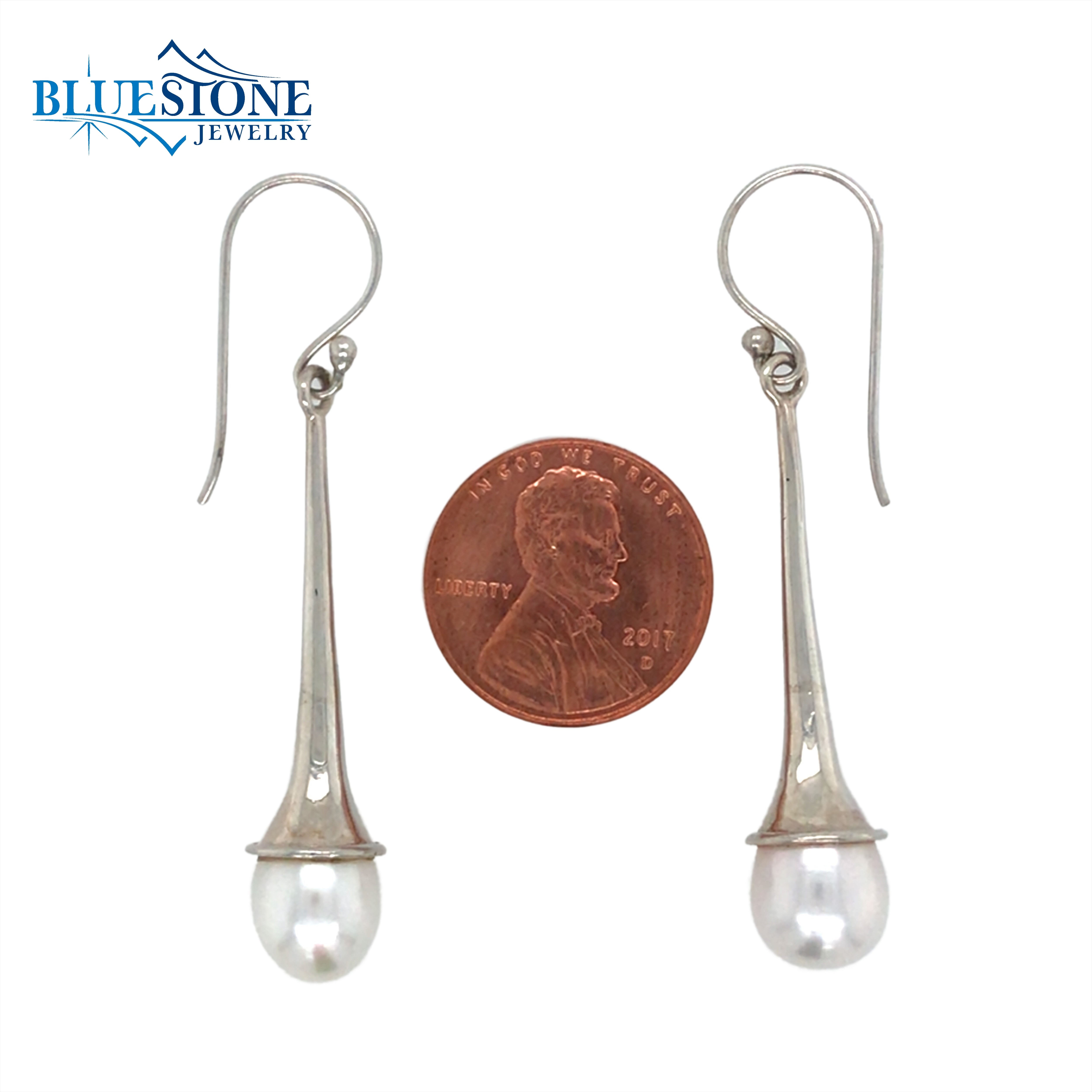 Sterling Silver Long Wire Earrings with Two 8.5mm Wide White Freshwater Pearls. Earrings Measure 2 Inches Long.Local Lake Tahoe Designer.