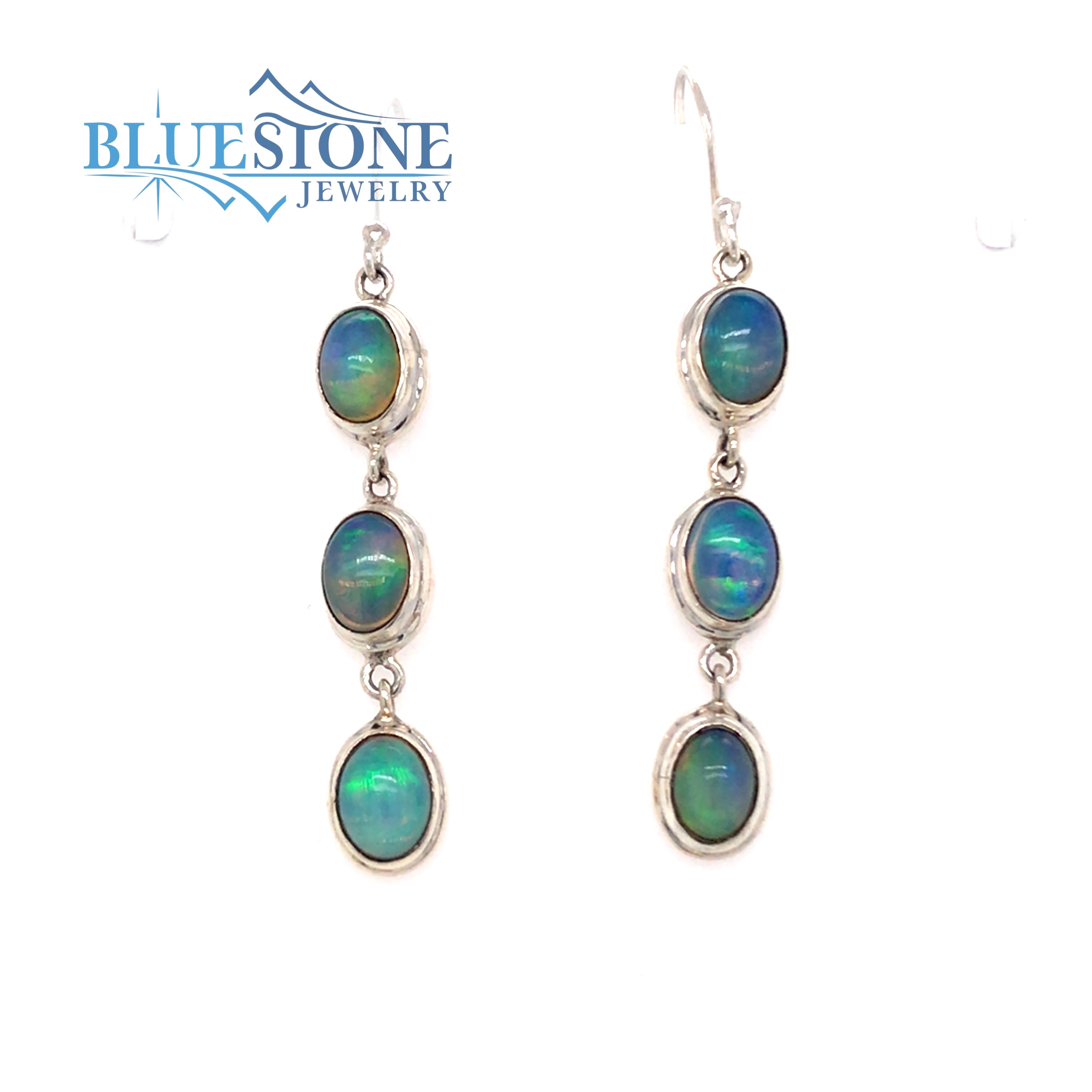 Sterling Silver Wire Earrings with Six 6mm x 8mm Natural Ethiopian Opals. Measure 2 Inches Long.Local Lake Tahoe Designer.