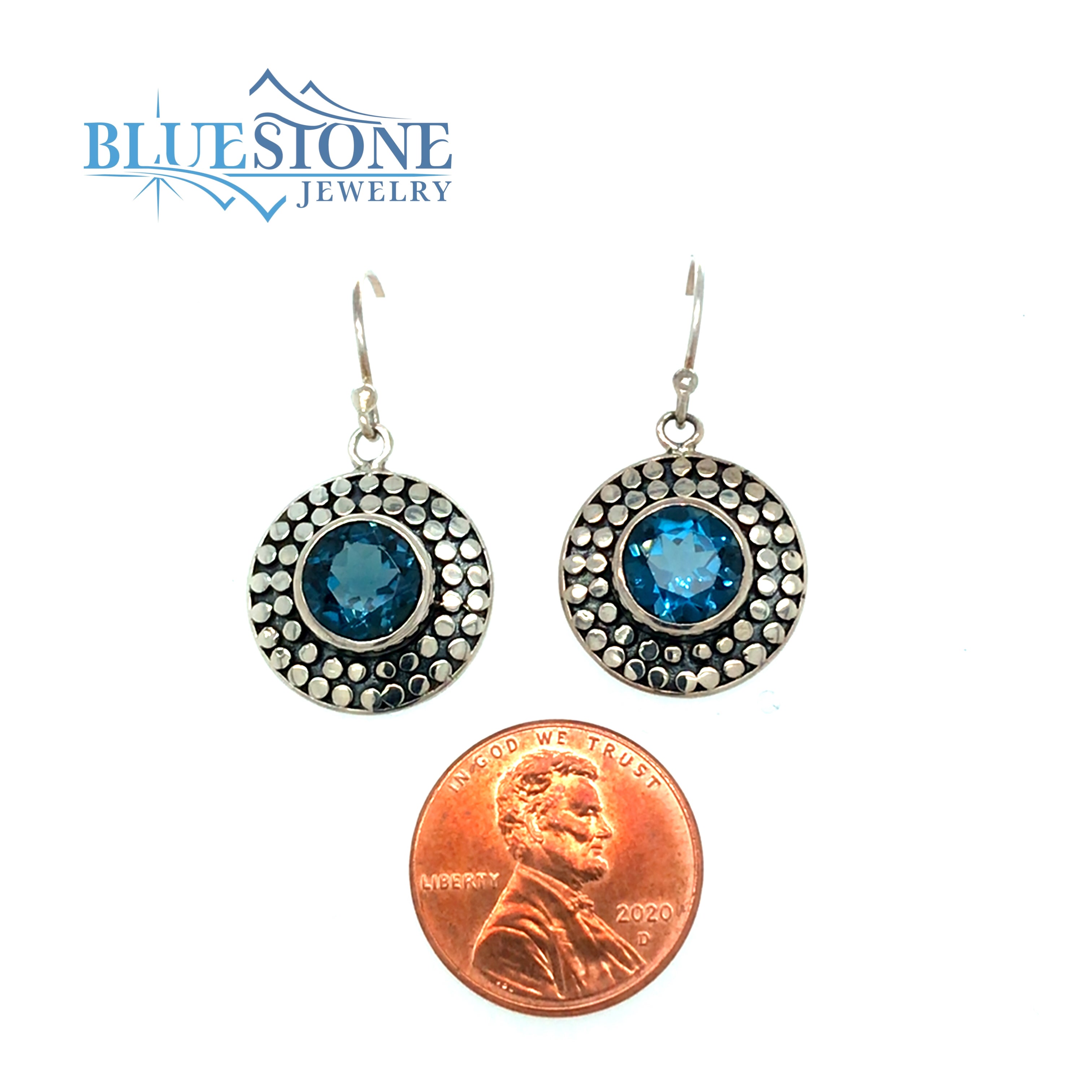 Sterling Silver Wire Earrings with Two Round Cut London Blue Topazes. Topazes Measure Approximately 8mm Wide.Local Lake Tahoe Designer