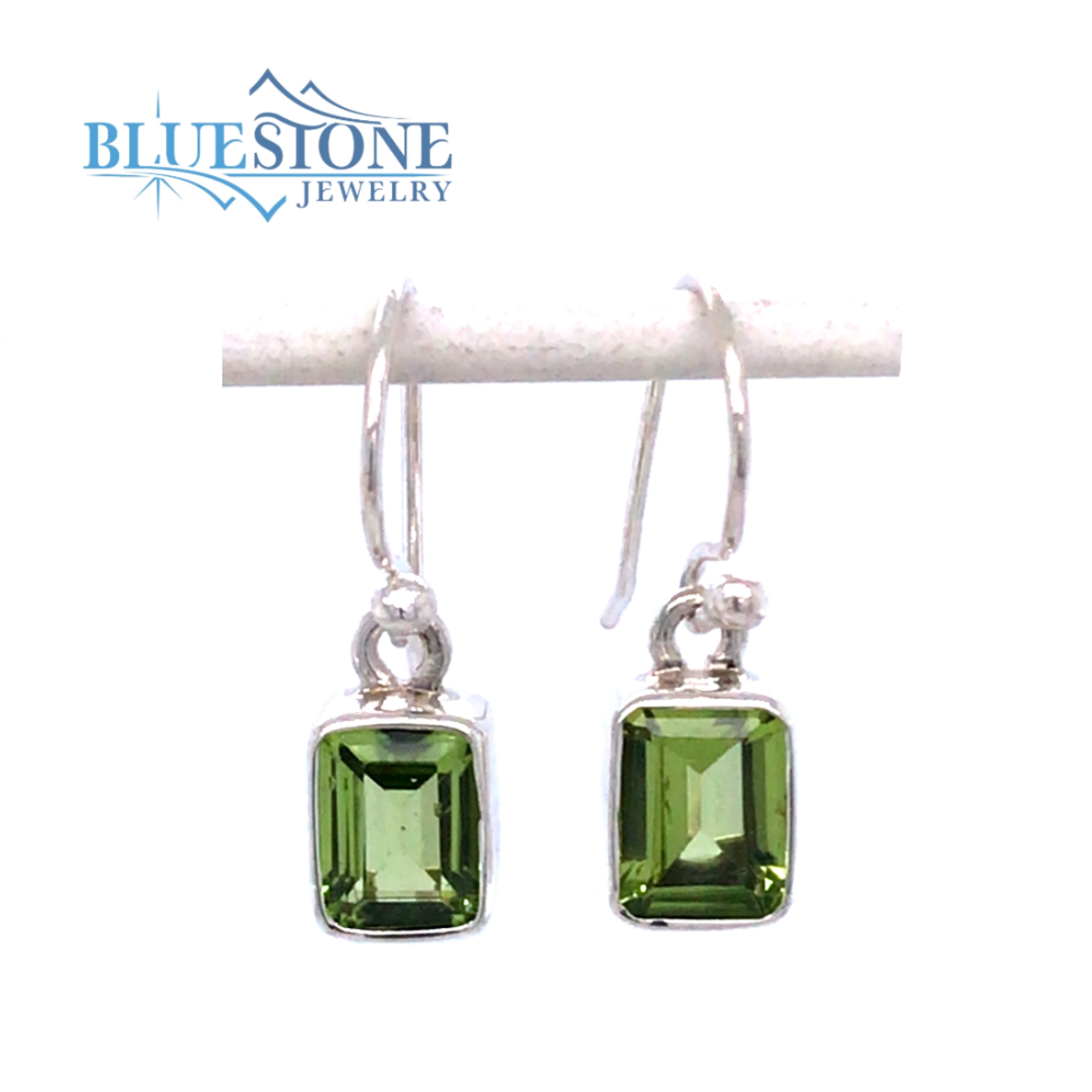 Sterling Silver Rhodium Plated Wire Earrings with Two 6mm x 8mm Rectangular Cut Peridot. Measure Approximately 1 Inch Long.