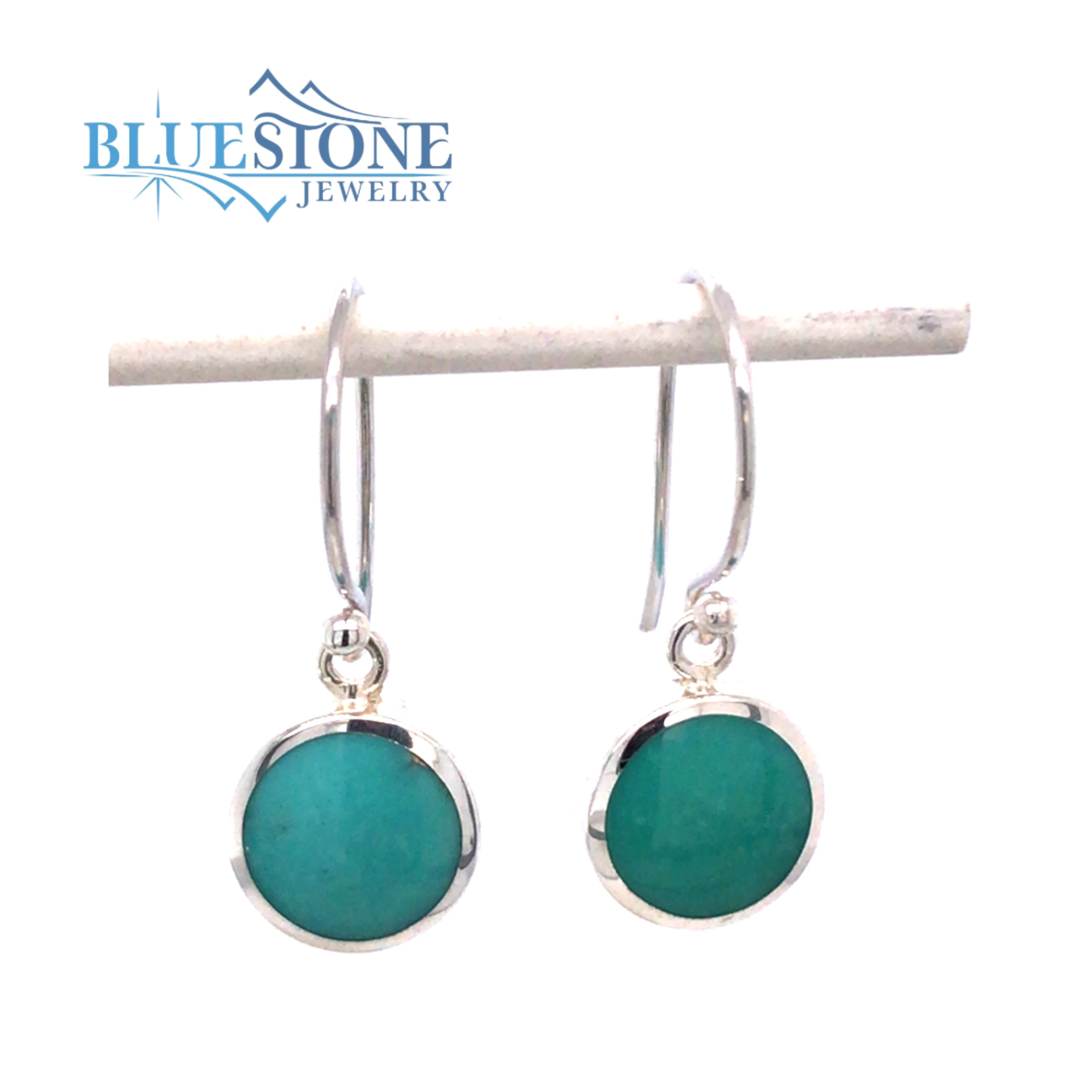 Sterling Silver Rhodium Plated Wire Earrings with Two 9mm Round Natural Turquoises. Measure 1 Inch Long.