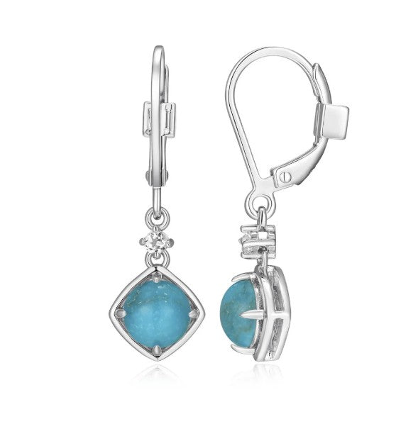 Sterling Silver and Rhodium Plated Lever Back Earrings with Two Cabochon Turquoise Gemstones and Two White Topaz Gemstones Accenting Turquoise.Earrings Measures 1" Long.Earrings Include Two Hidden Round Created Ruby Which Represents Inner Beauty, Inner Peace & Inner Strength.