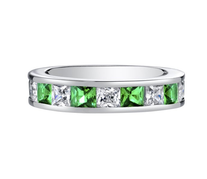 Sterling Silver Rhodium Plated Ring with Six 3mm Square Princess Cut Lab Created Emeralds at 1.00 Total Carat Weight and Five 3mm Square Cut Cubic Zirconias. Ring Size 6. Can be ordered in other ring sizes. Please inquire.
