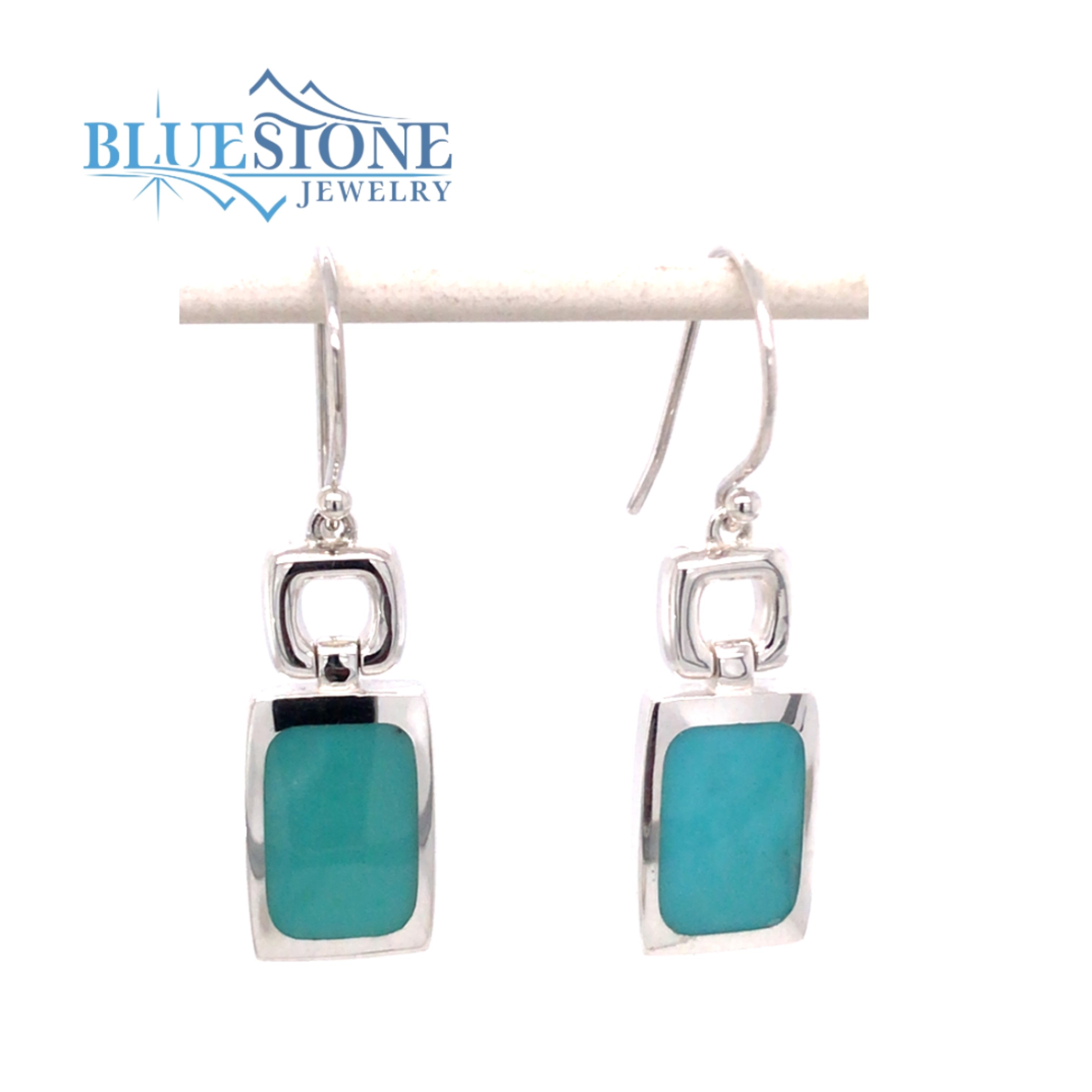 Sterling Silver Rhodium Plated Wire Earrings with Two Natural Rectangle Cut Turquoise Gemstones. Earrings Measure 1.5 Inches Long.