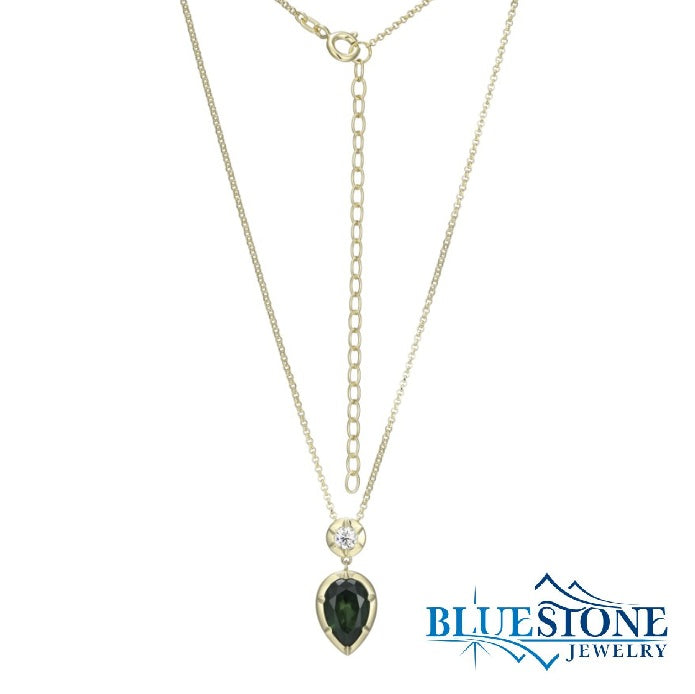 Sterling Silver 10 Karat Yellow Gold and Rhodium Plated Sliding Pendant with One 12mm x 8mm Pear Cut Green Cubic Zirconia and a 4mm Round Cubic Zirconia. Comes on a 19" Rolo Chain. Can be worn between 16" to 19".