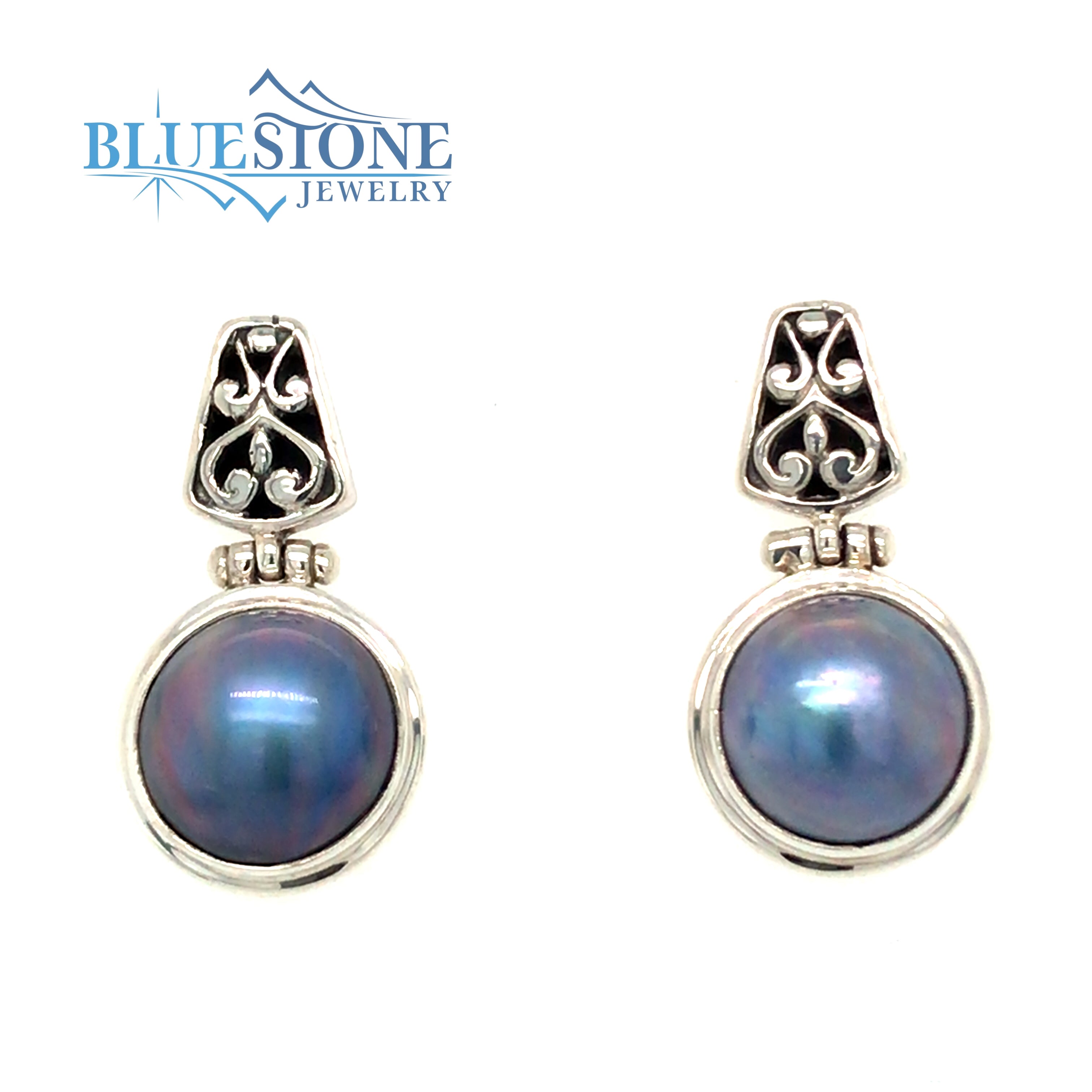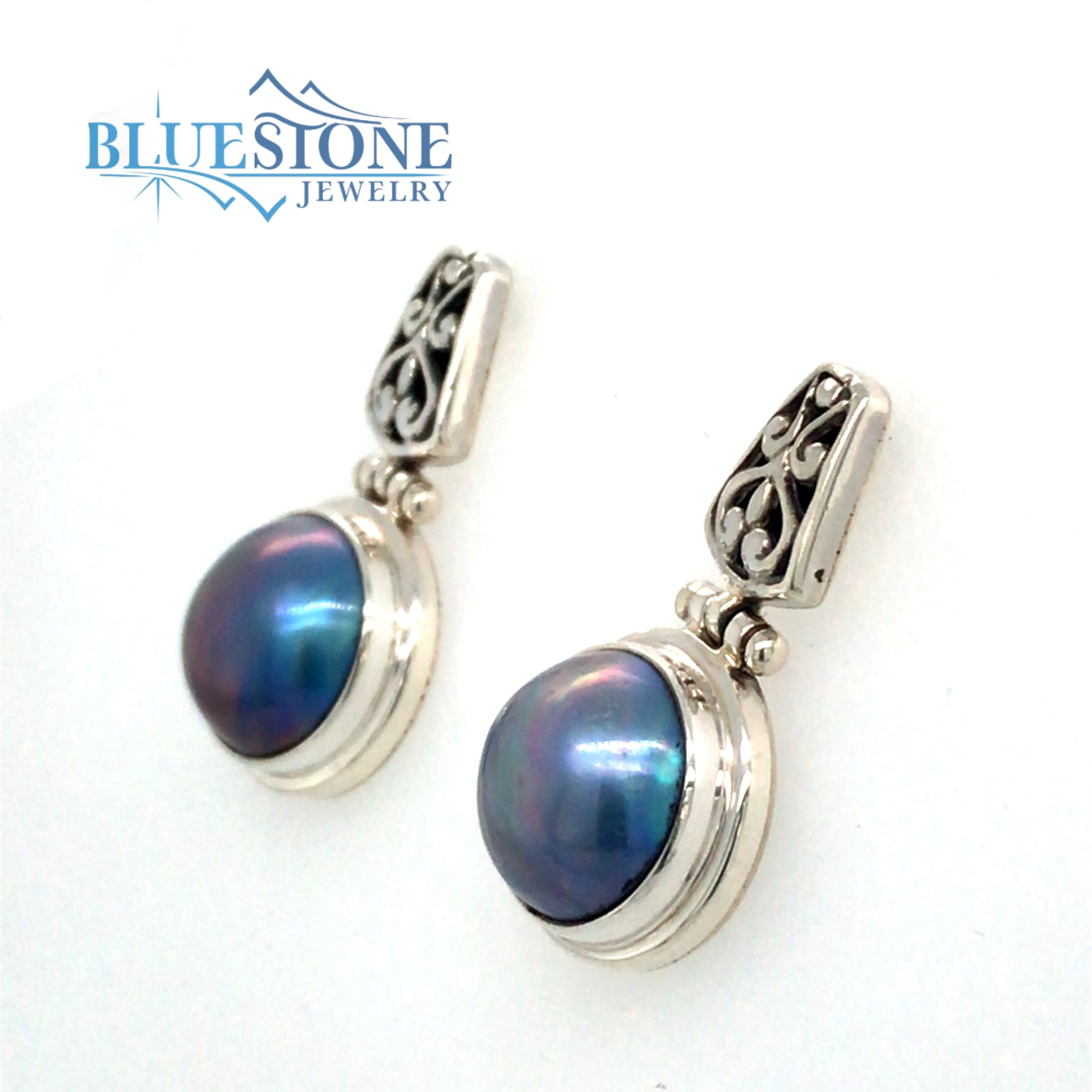 Sterling Silver Post Drop Earrings with Two 11mm Wide Blue/Grey Mabe Pearls.Local Lake Tahoe Designer.
