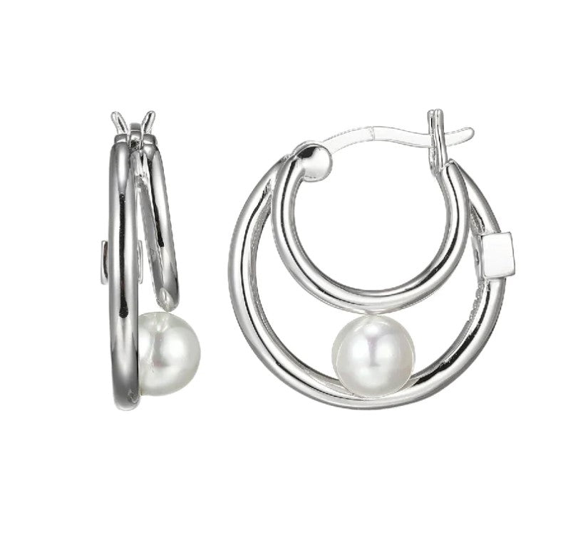 Sterling Silver and Rhodium Plated Double Hoop Earrings with Two 5mm Round White Shell Pearls. Earrings Include Two Hidden Round Created Rubies Which Represents Inner Beauty, Inner Peace & Inner Strength. Earrings Measure 3/4 Inch Long.