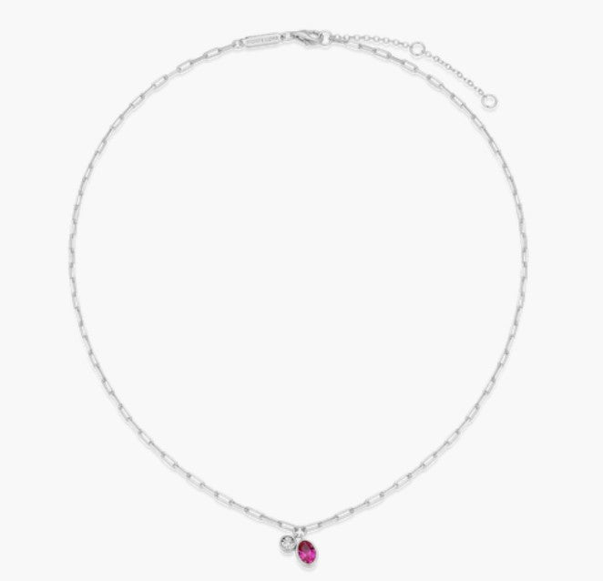 Sterling Silver and Rhodium Plated Paperclip Necklace with One 9mm Bezel Set Oval Created Ruby at 0.6 Carat Total Weight and One 4.3mm SI G-H Bezel Set Round Lab Grown Diamond at 0.2 Carat Total Weight. Necklace Length is 18", can be worn at17" and 16".
