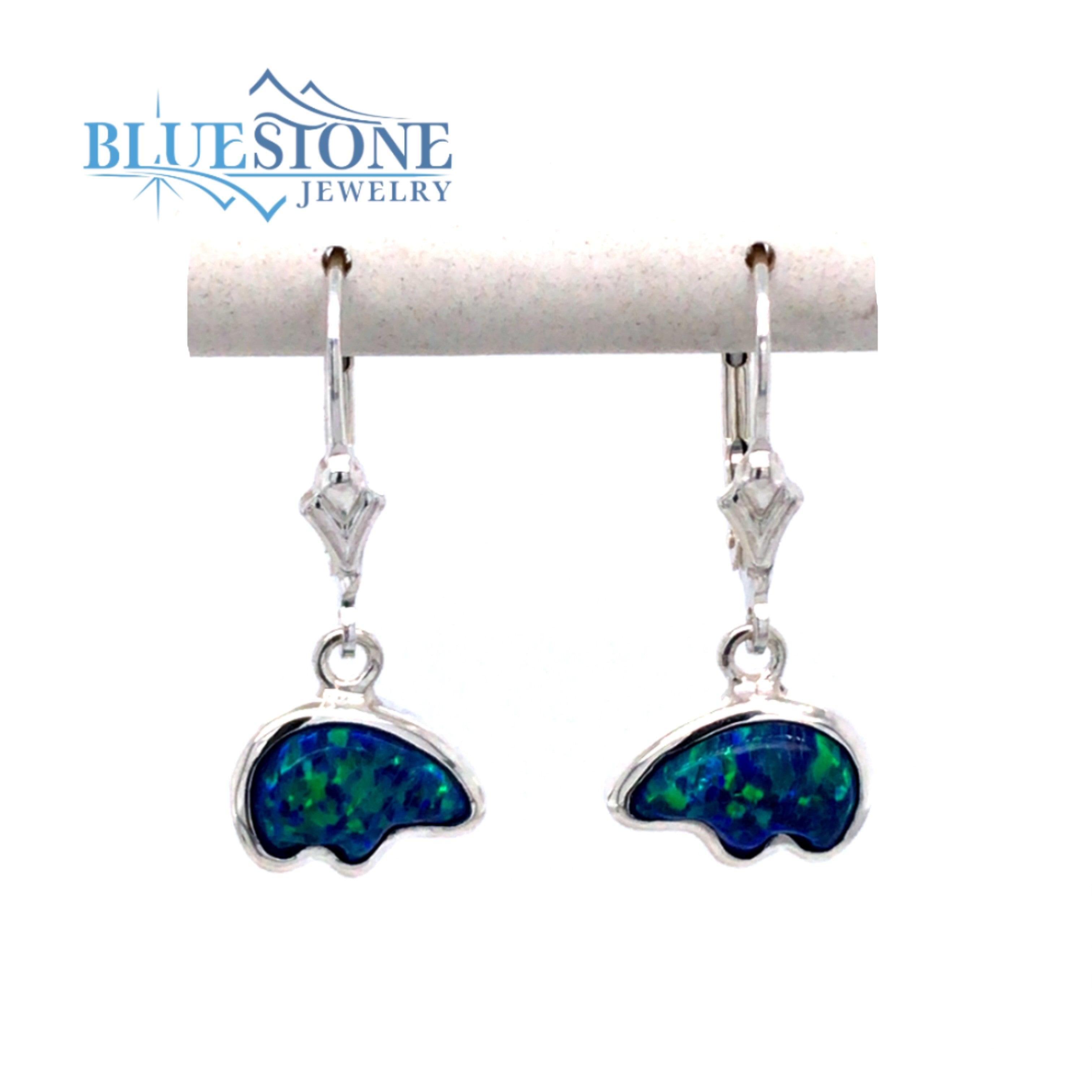 Sterling Silver Lever Back Earrings with 2 Bear Shaped Lab Grown Opals Gemstones. Bears Measure 3/8 Inch Wide.