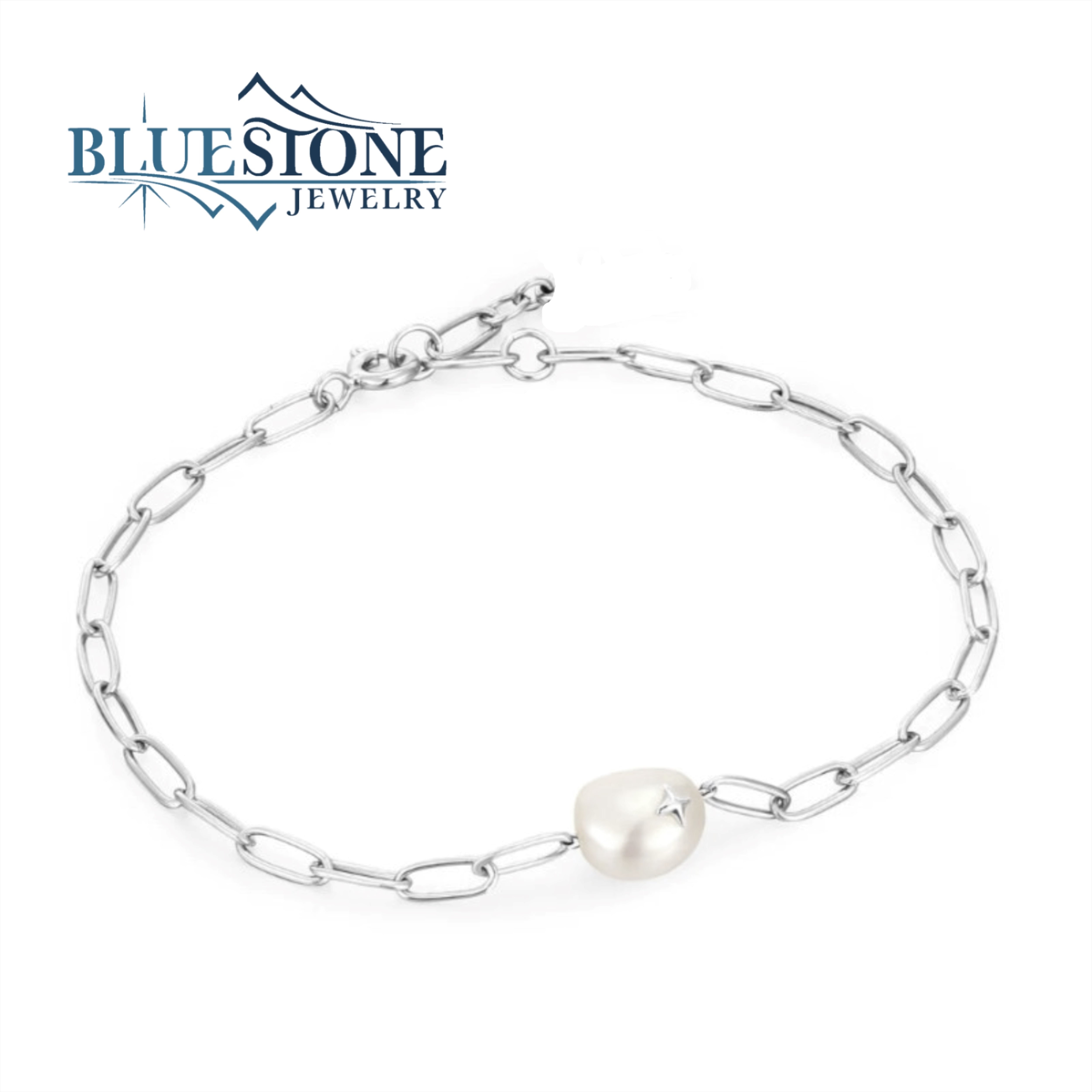 Sterling Silver Rhodium Plated Chain Link Bracelet with One White Freshwater Pearl. Measures 7 Inches Long.