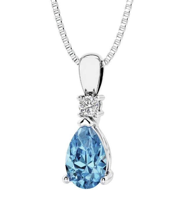 Sterling Silver and Rhodium Plated Solitaire Pendant with One 8mm x 5mm Pear Cut London Blue Topaz and One 2.4mm Round Lab Grown Diamond. Pendant Comes on an 16" Inch Box Chain. Pendant Measures 7mm.