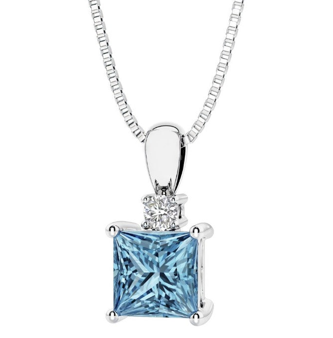 Sterling Silver and Rhodium Plated Solitaire Pendant with One 6mm x 6mm Princess Cut London Blue Topaz and One 2.4mm Round Lab Grown Diamond. Pendant Comes on an 20" Inch Box Chain. Pendant Measures 4.8mm.