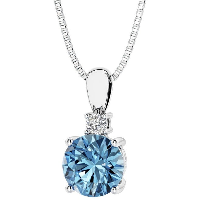 Sterling Silver and Rhodium Plated Solitaire Pendant with One 7mm Round Cut London Blue Topaz and One 2.4mm Round Lab Grown Diamond. Pendant Comes on an 16" Inch Box Chain. Pendant Measures 5mm Long.