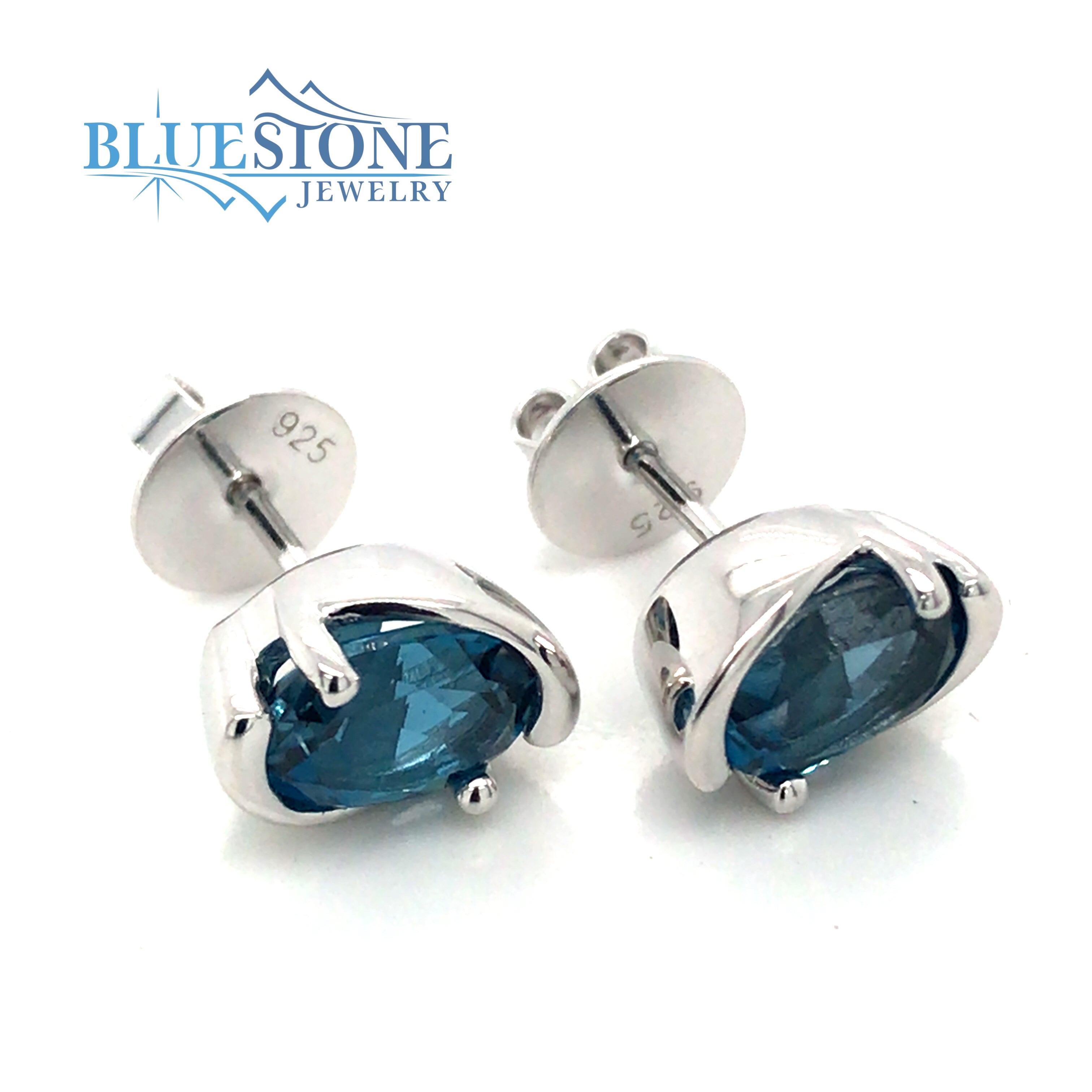 Sterling Silver Rhodium Plated Stud Earrings with Two Oval Cut London Blue Topazes at 2.00 Total Carat Weight.