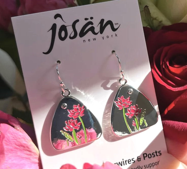 Sterling Silver Lotus Flower Earrings with French Hooks Featuring Hand Painted Enamel Accents and Two Cubic Zirconias. Measure 3/4 Inch by 1.25 Inches.All sales benefit the Vietnam Relief Services charity, improving the quality of schools in remote parts of Vietnam.