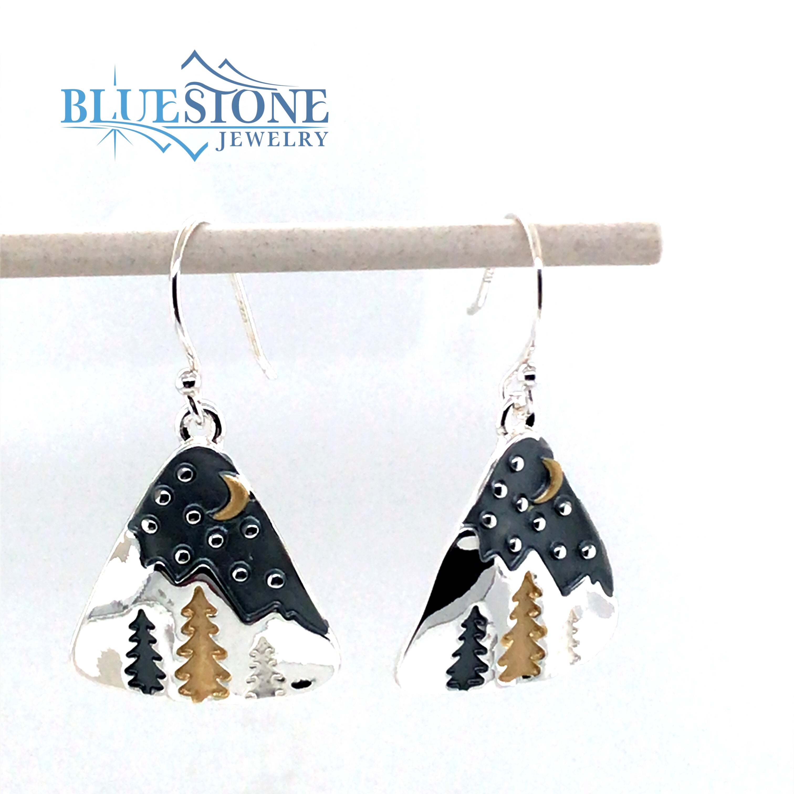 Sterling Silver Earrings with French Hooks with Mountain and Night Sky Scene. Feature Hand Lacquered Grey and Gold Accents. Measure 3/4 Inch by 3/4 Inch.All sales benefit the Vietnam Relief Services charity, improving the quality of schools in remote parts of Vietnam.