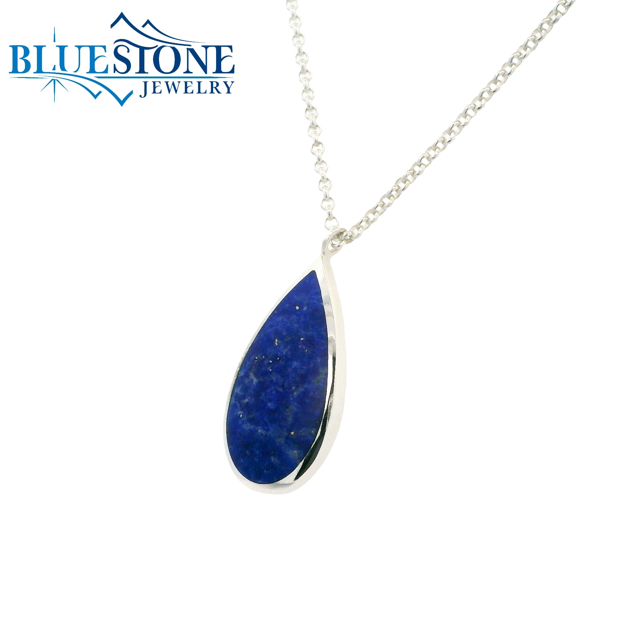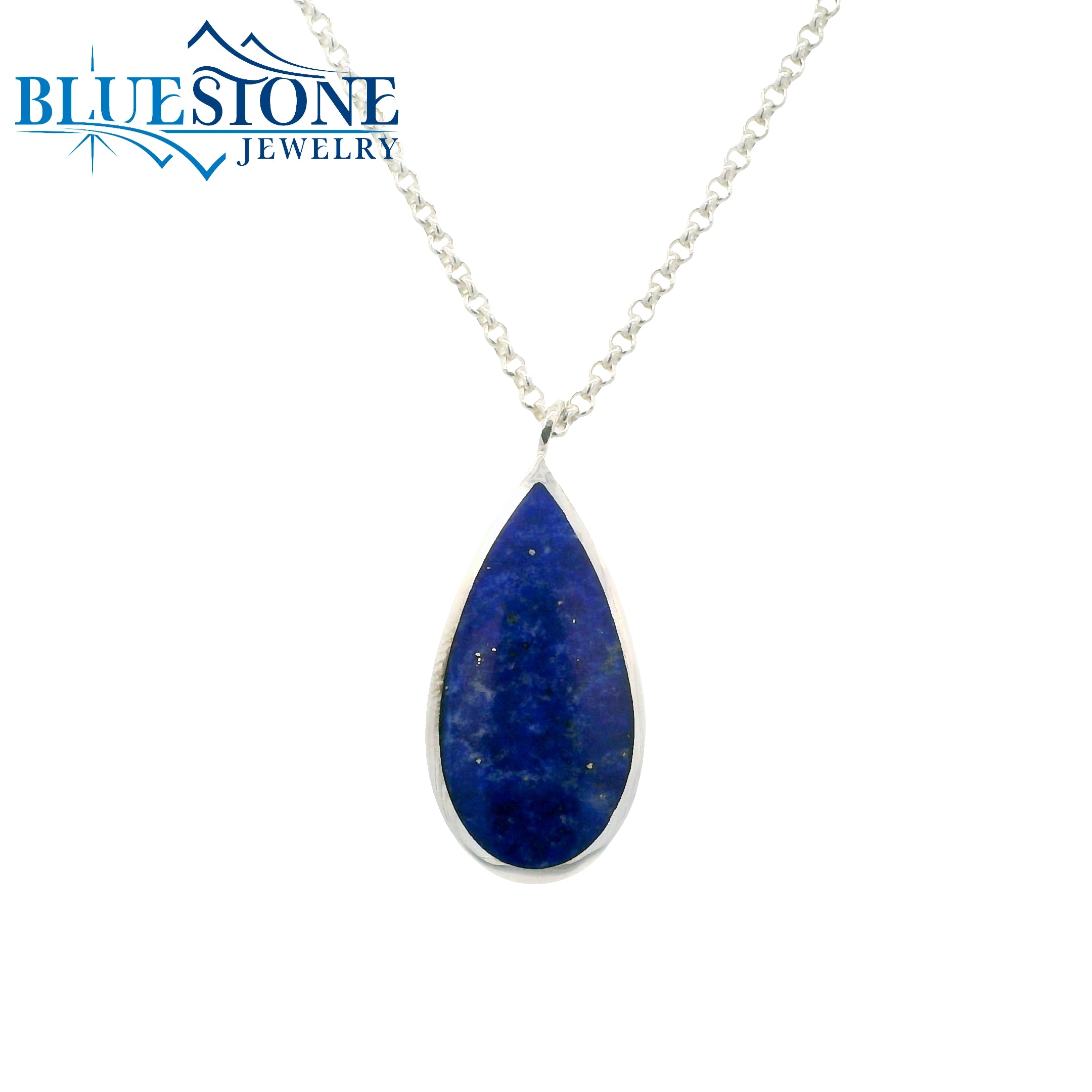 Sterling Silver Rhodium Plated Necklace With One 24mm x 12.8mm Natural Pear Cut Lapis Lazuli Gemstone, With Two Additional Lapis Found On Toggle Closure. Pendant Comes on a 2mm Rolo Chain, Can Be Worn Between 19 Inches And 20.5 Inches.