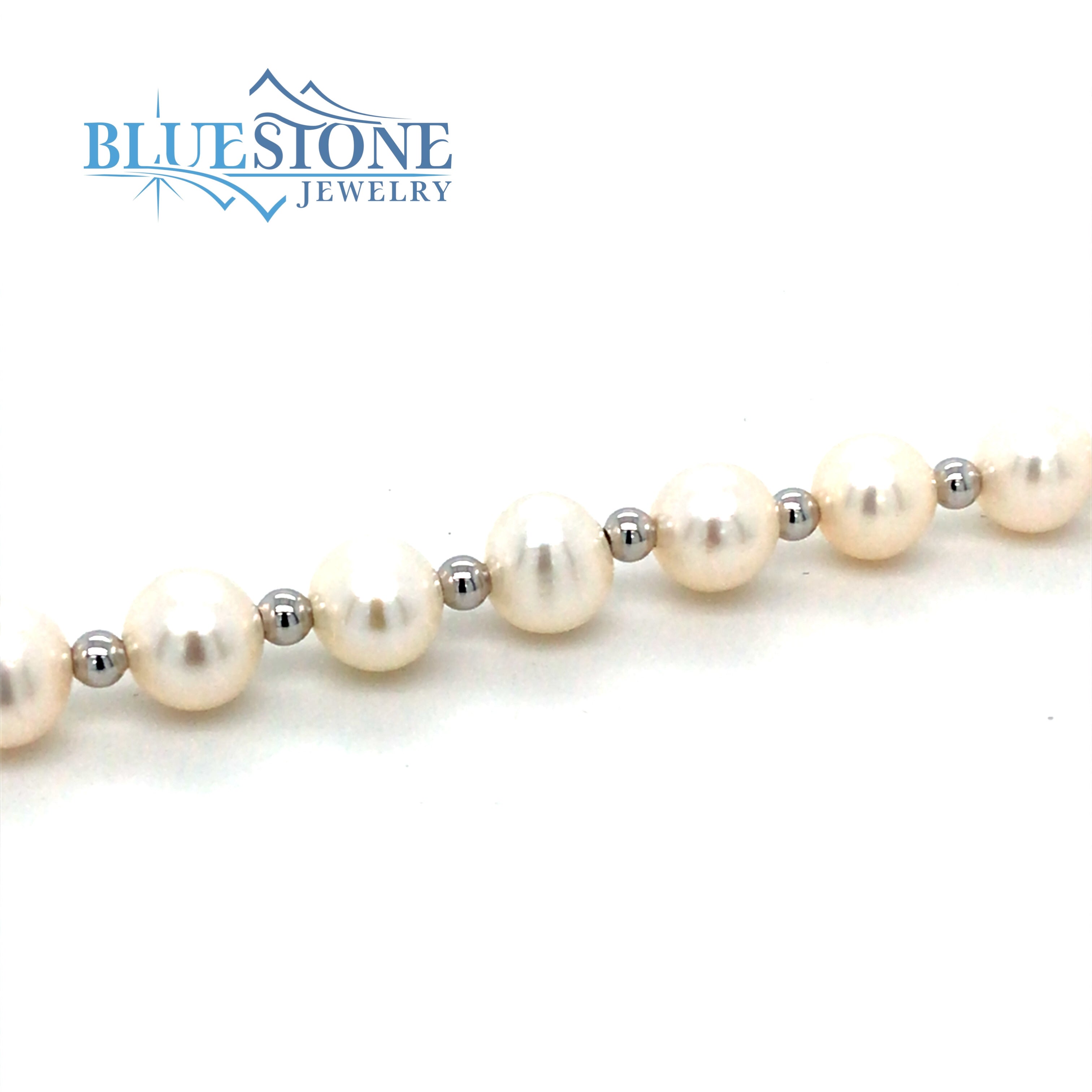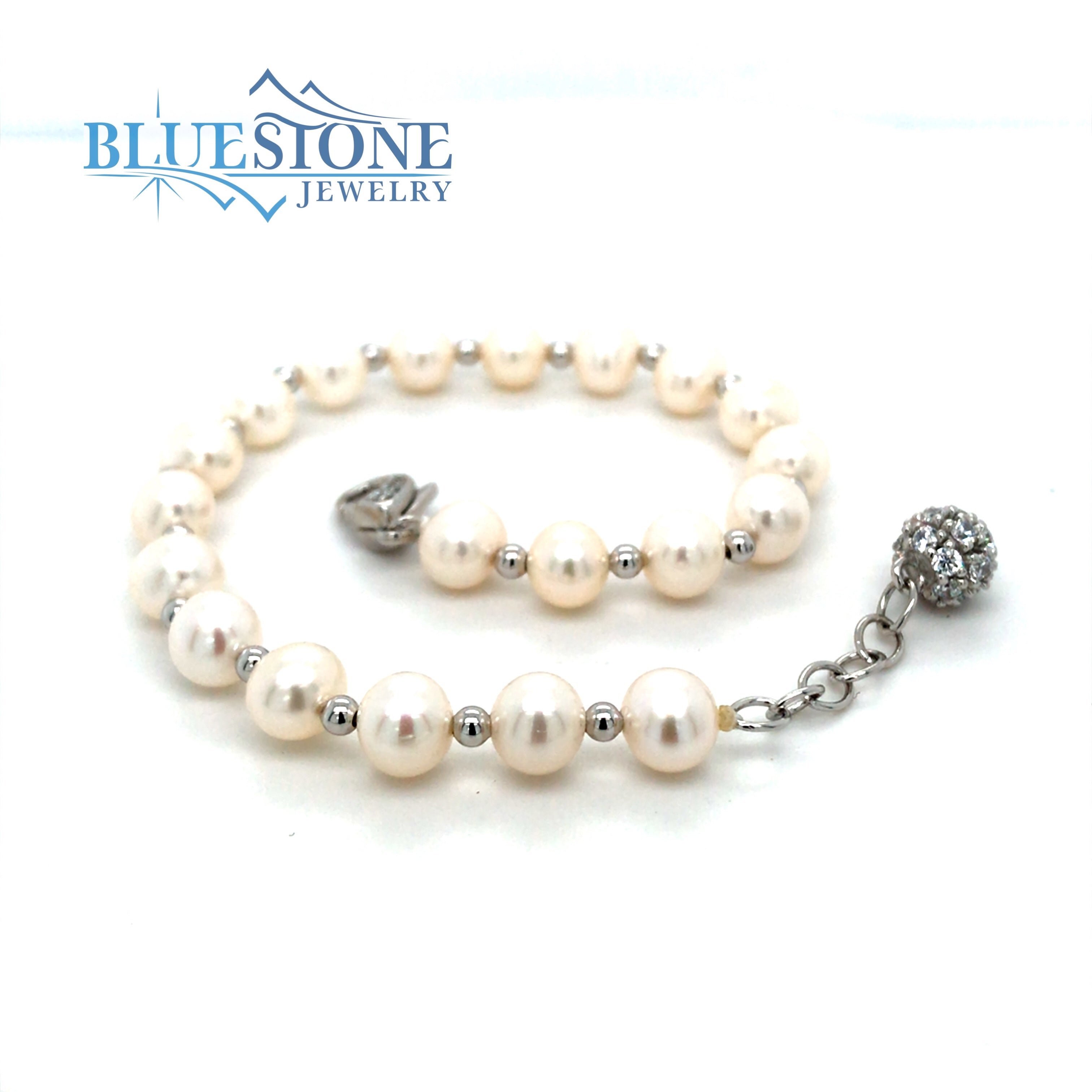 Sterling Silver Rhodium Plated Bracelet with Twenty 6mm Wide White Freshwater Pearls with Mini Silver Balls Between Pearls. Along with Cubic Zirconia Accents Along Clasp. Bracelet Measures 7.5 Inches Long. Can be worn at 7 inches.