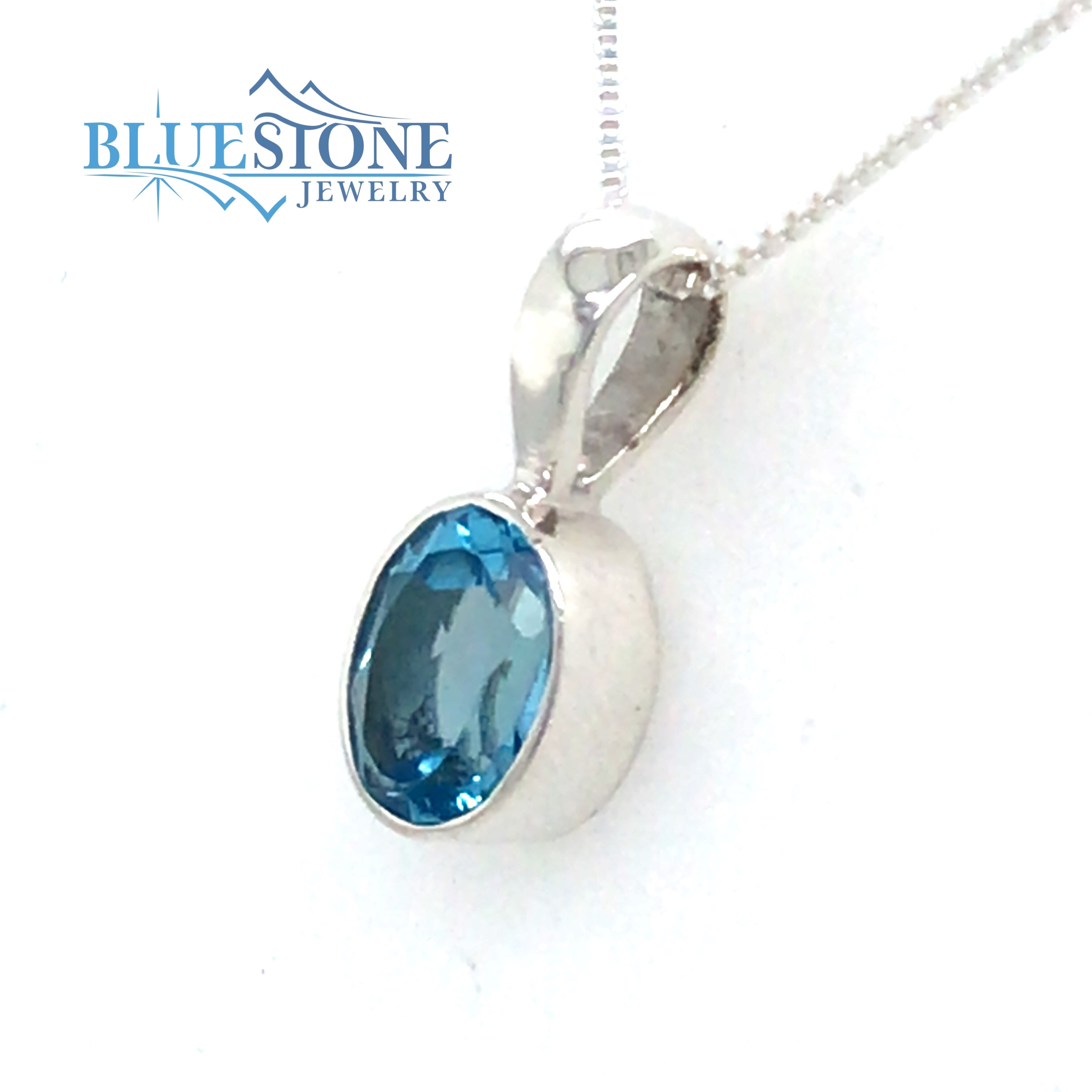 Sterling Silver Rhodium Plated Pendant with One 6mm x 8mm Oval Cut Blue Topaz. Pendant Measures 5/8 Inch Long. Comes on an 18 Inch Sterling Silver Box Chain.