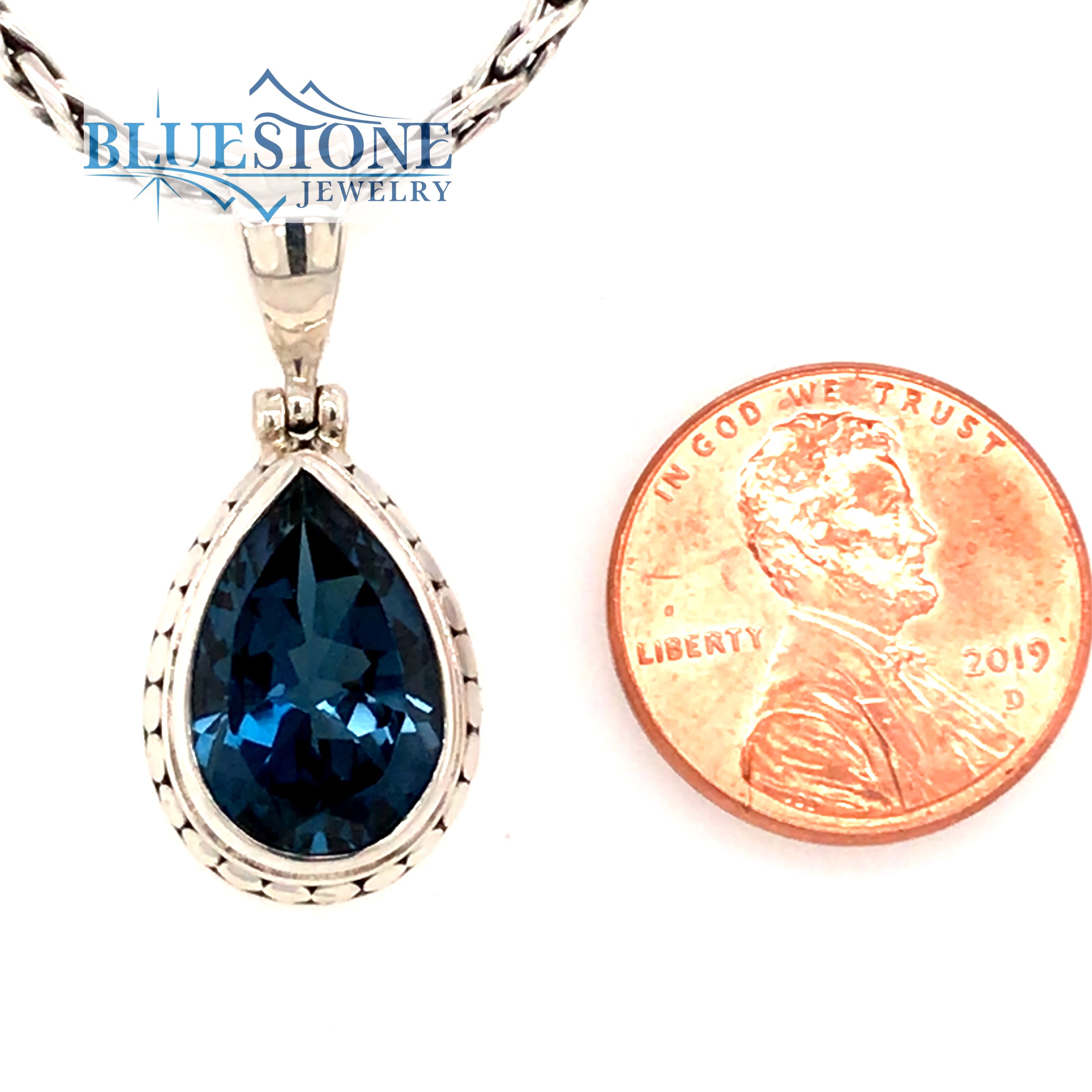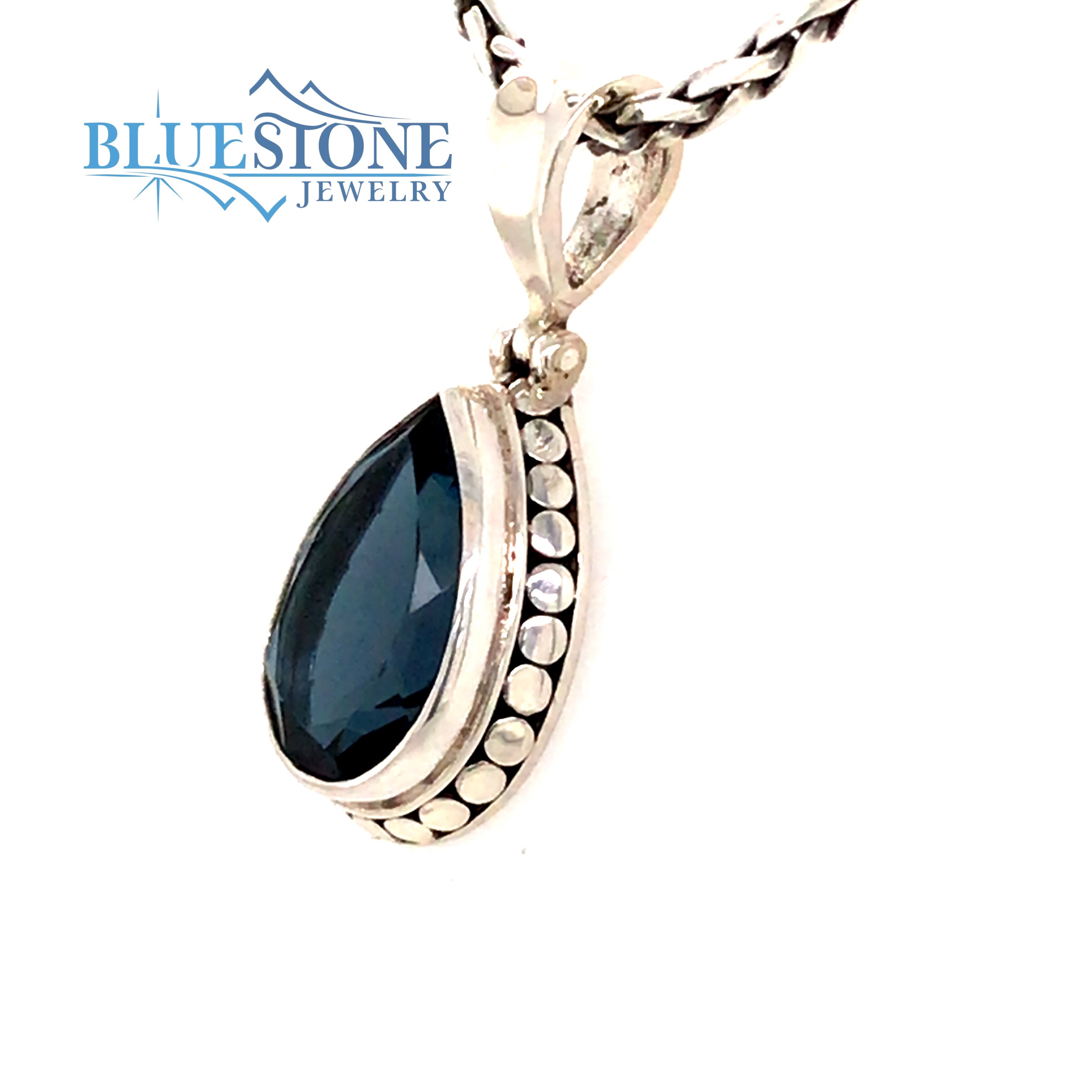 Sterling Silver Pendant with a Pear Cut London Blue Topaz gemstone on a Silver Hand Woven Chain measuring 17 inches.Lake Tahoe Designer