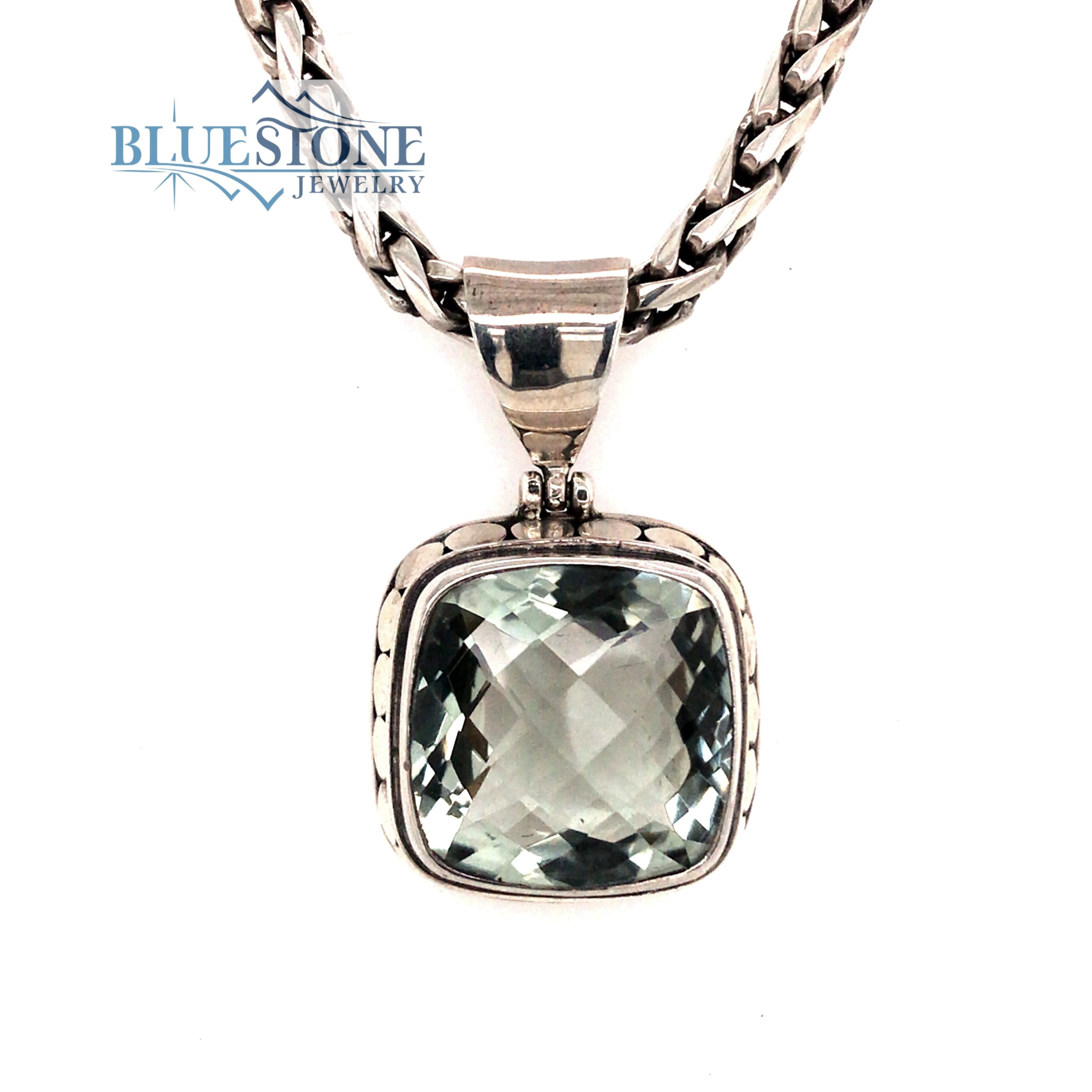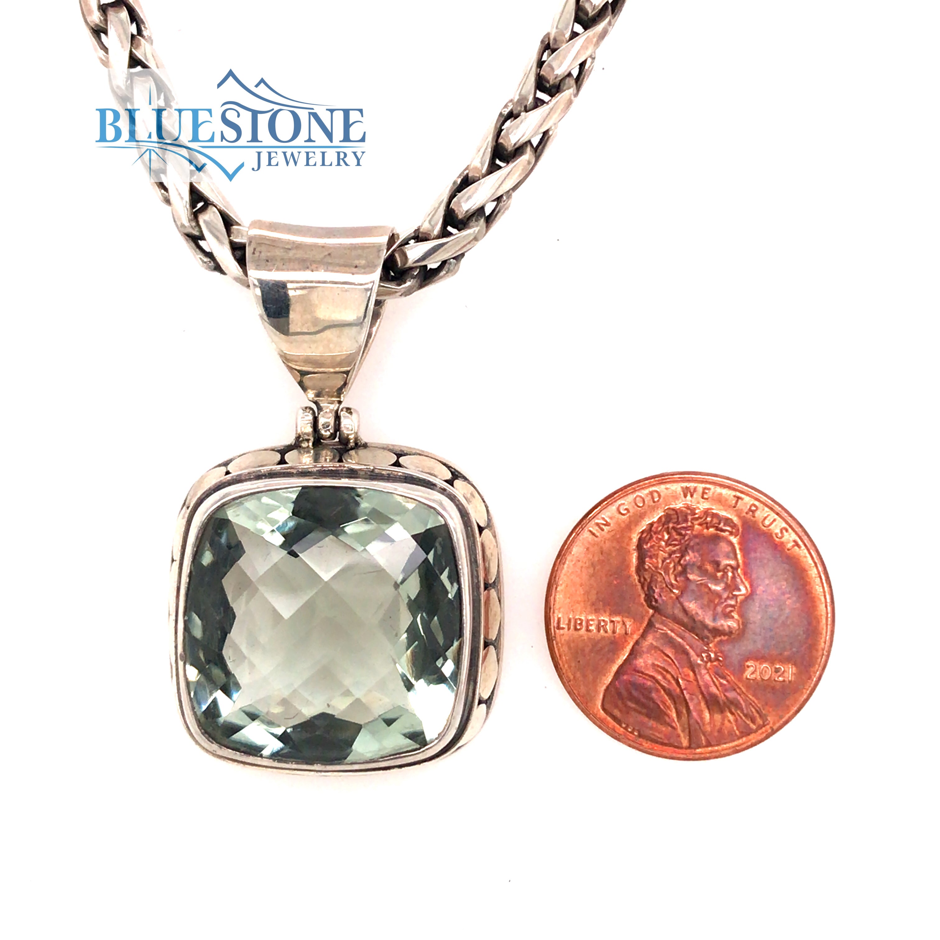 Sterling Silver Pendant with One 12mm Wide Square Cushion Cut Green Amethyst. Comes on a 16 Inch Fine Handwoven Sterling Silver Chain.Local Lake Tahoe Designer.