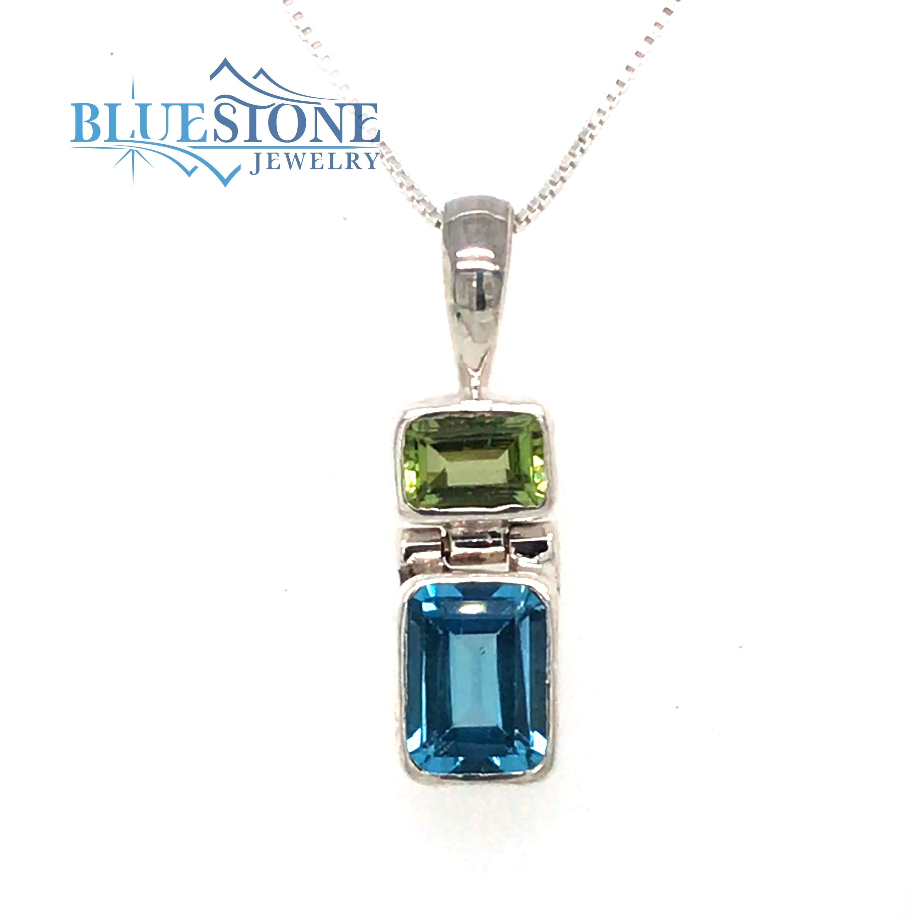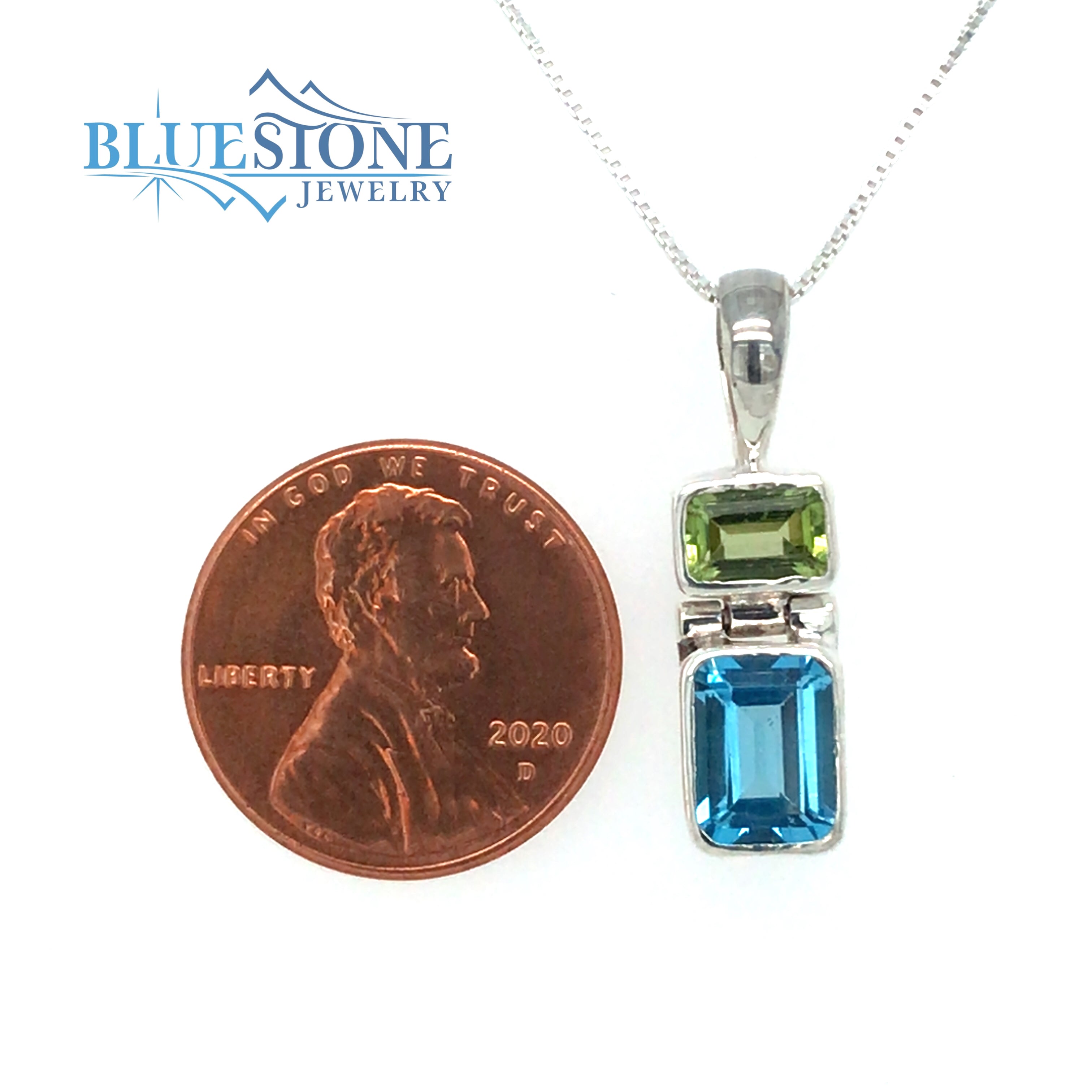 Sterling Silver Rhodium Plated Pendant with One 6mm x 8mm Rectangular Cut Blue Topaz and One 4mm x 6mm Oval Cut Peridot. Comes on an 18 Inch Sterling Silver Box Chain.