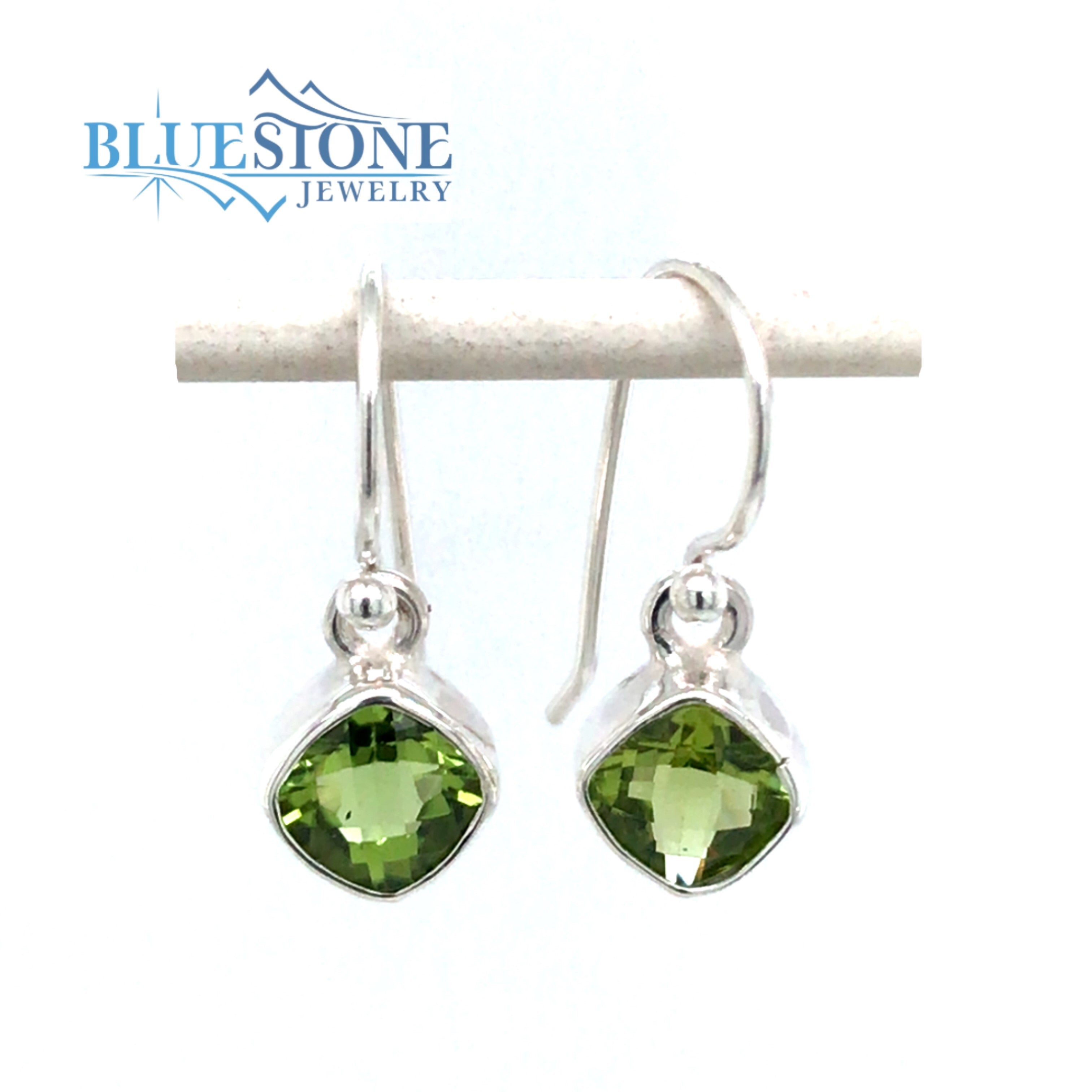 Sterling Silver Rhodium Plated Wire Earrings with Two 6mm Square Cushion Cut Peridots. Measure Approximately 7/8 Inch Long.