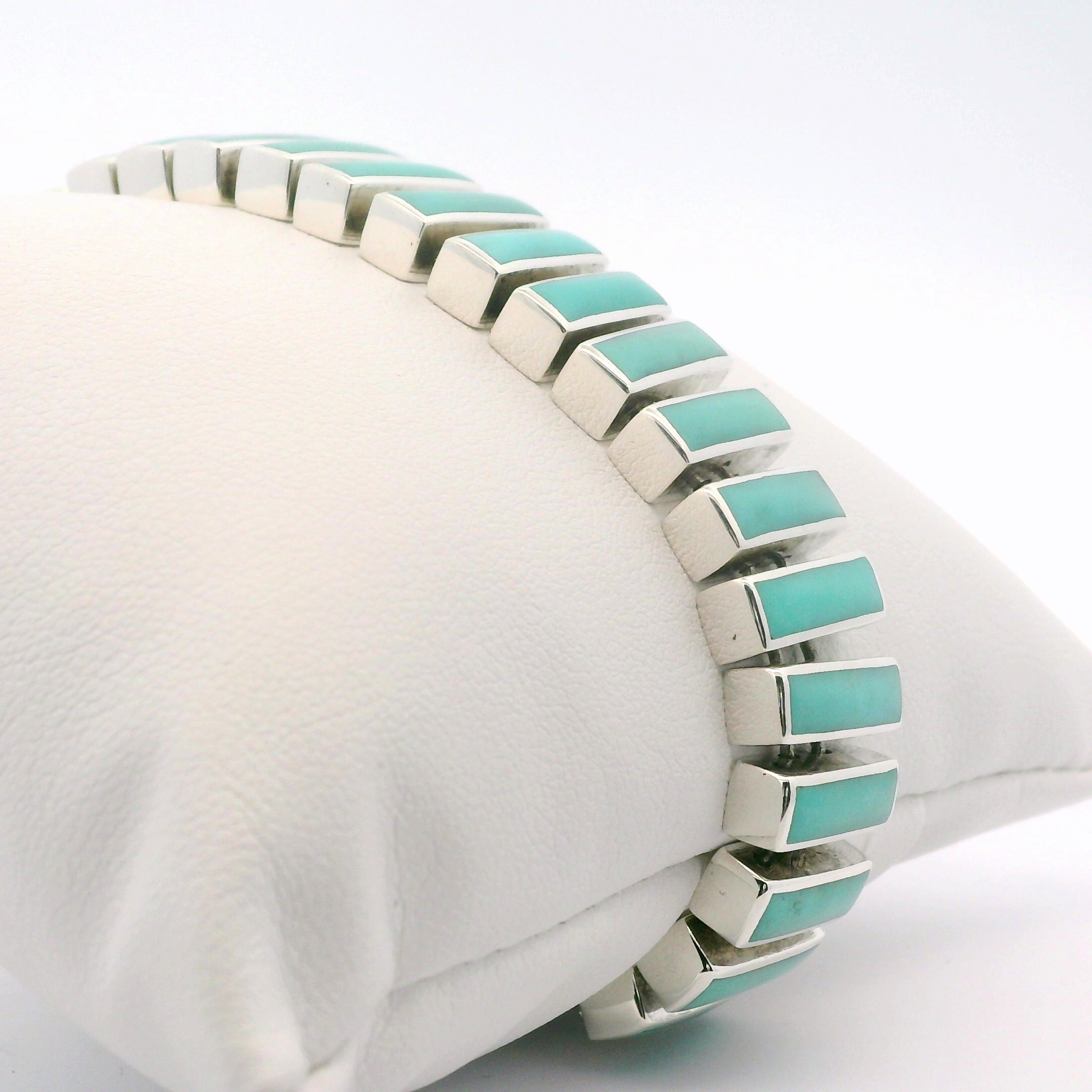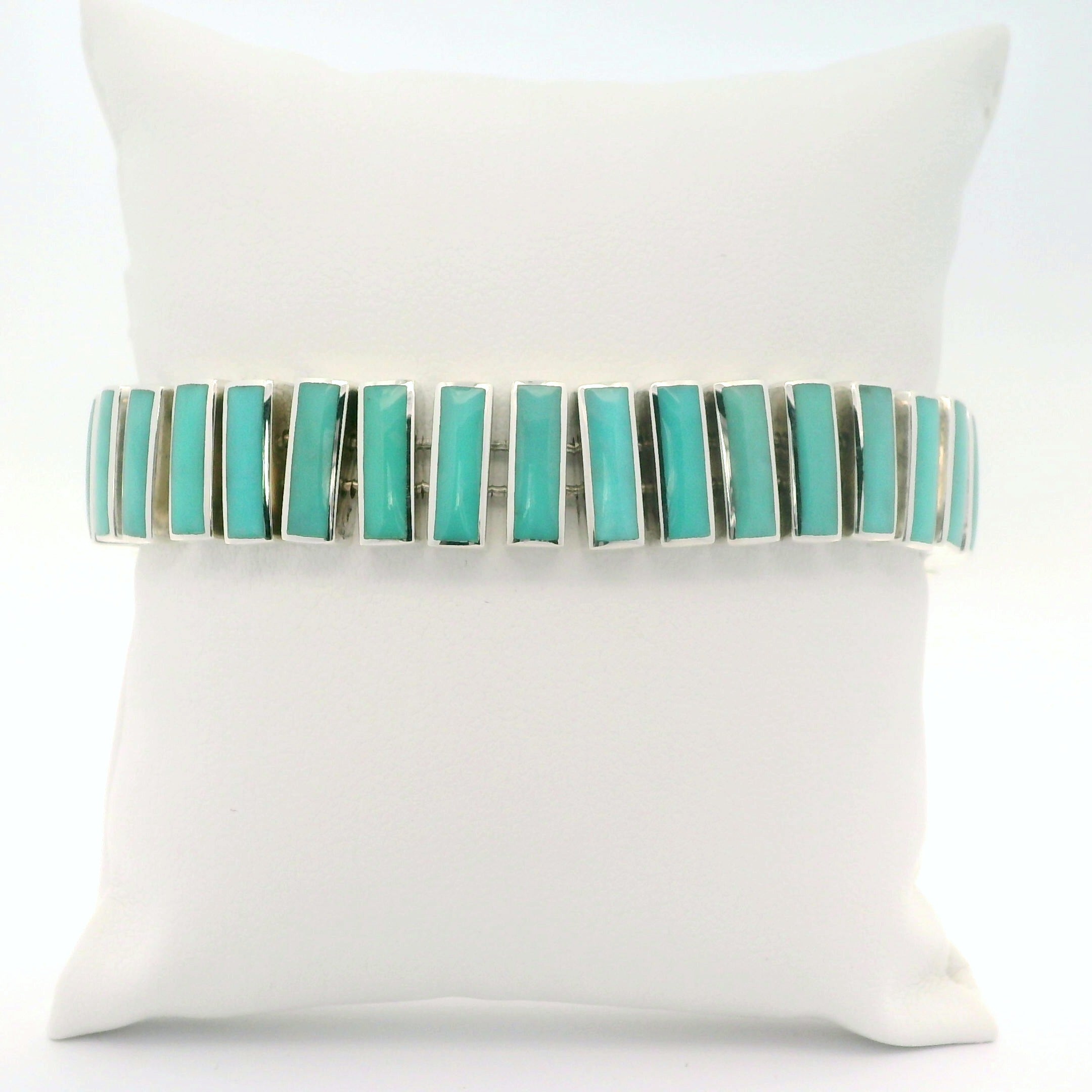 Sterling Silver Rhodium Plated Bracelet with 26 Rectangle Cut Natural Turquoises and Two Round Turquoises on Toggle. Can be worn between 6.5 inches and 8 inches. Bracelet width is 0.5".
