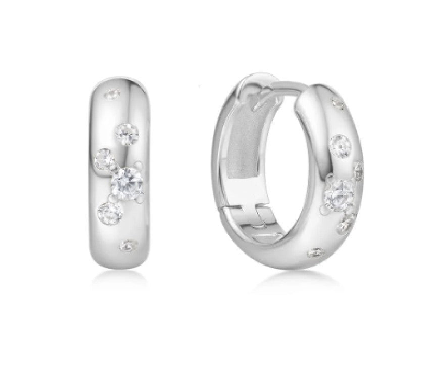 Sterling Silver and Rhodium Plated Chubby 3.9mm Small Huggie Hoop Earrings with 12 Flush Set Cubic Zirconia Gemstones.Earrings Measure Approximately 0.37" x 0.16".