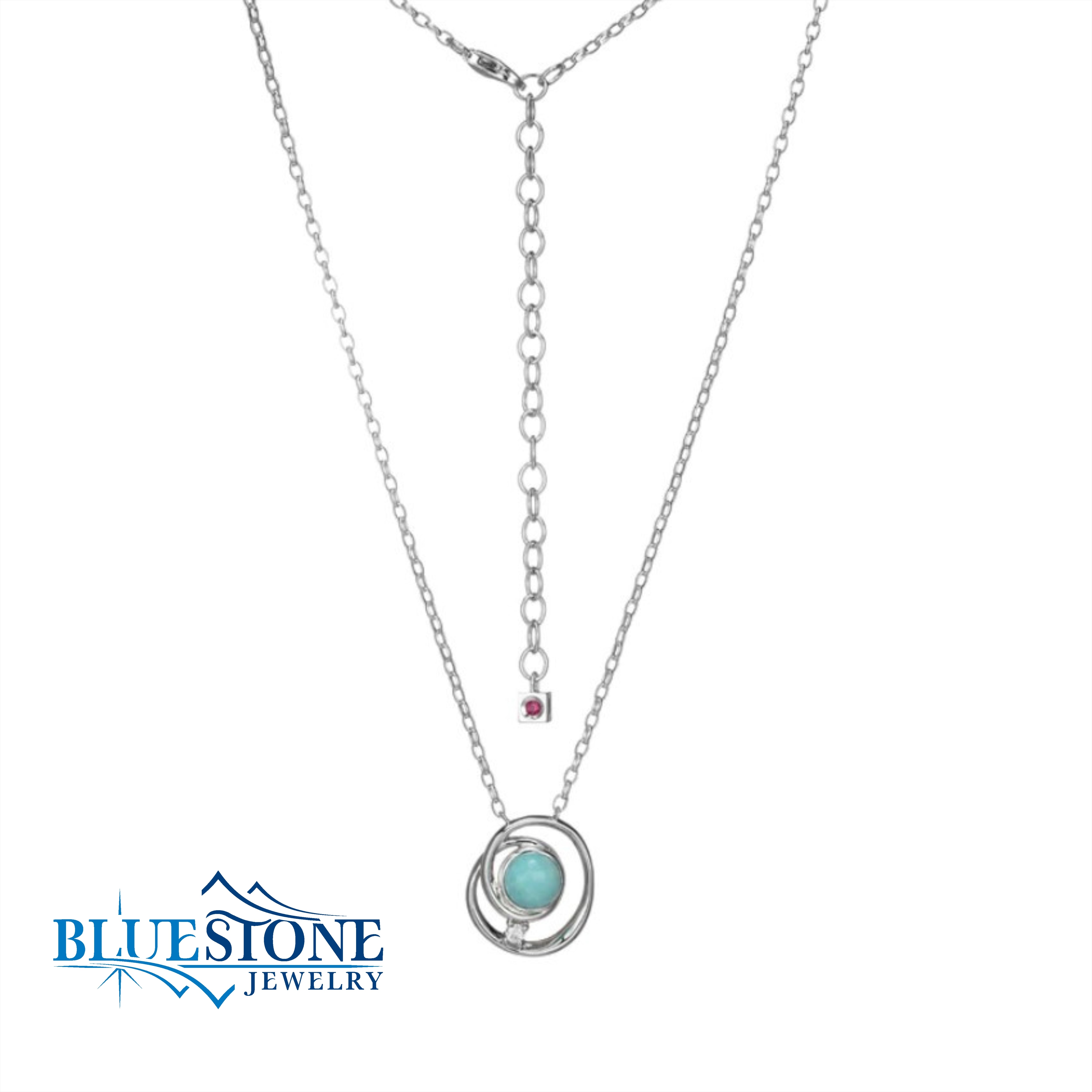 Sterling Silver Rhodium Plated Necklace with One 7mm Round Genuine Peru Amazonite, One Round Moissanite and One Round Hidden Lab Created Ruby which represents inner beauty, inner peace & inner strength. Full length of 20", can be worn at 19", 18" and 17".
