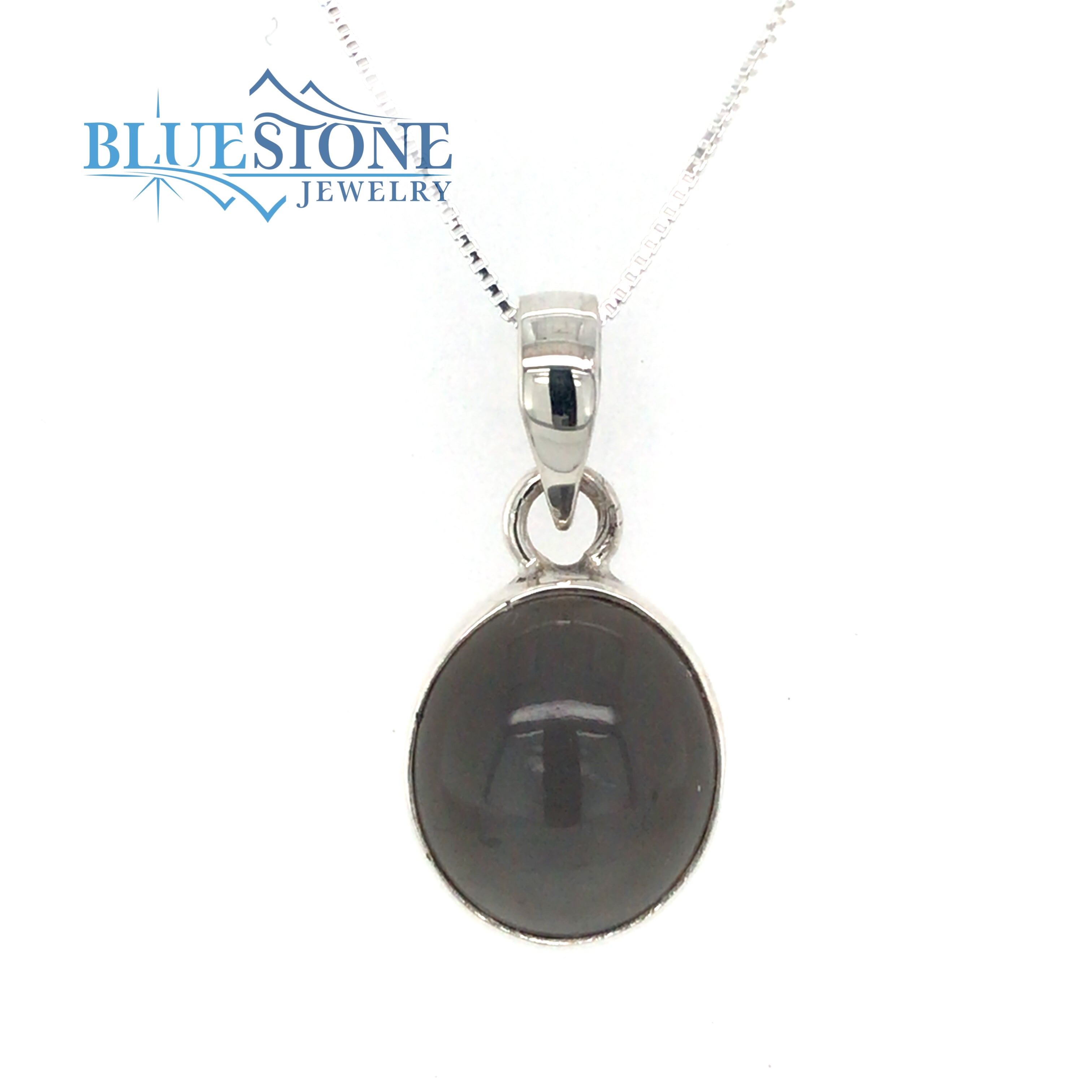 Sterling Silver Rhodium Plated Pendant Featuring One Grey Toned Oval Cut Moonstone. Pendant Measures 1/2 Inch by 1 Inch Long. Comes on an 18 Inch Sterling Silver Box Chain.
