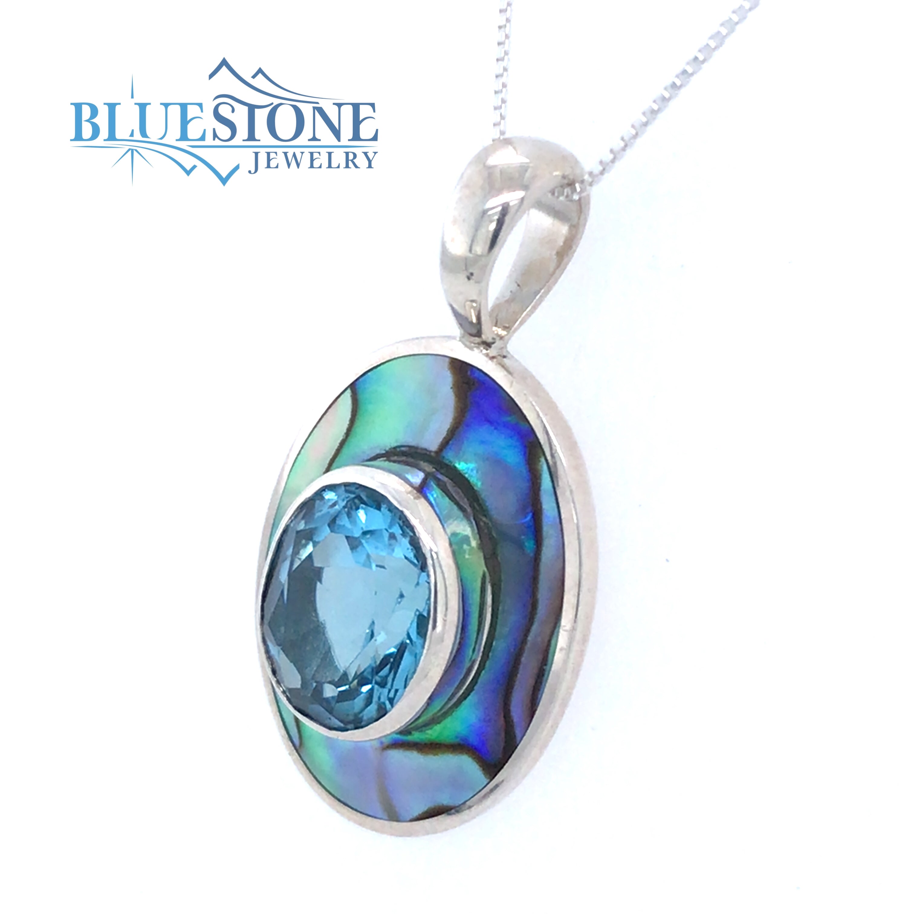 Sterling Silver Rhodium Plated Pendant Featuring One Oval Shaped Natural Abalone Shell and One 9mm x 12mm Oval Cut Blue Topaz. Pendant Measures 3/4 Inch x 1.25 Inches Long. Comes on an 18 Inch Sterling Silver Box Chain.