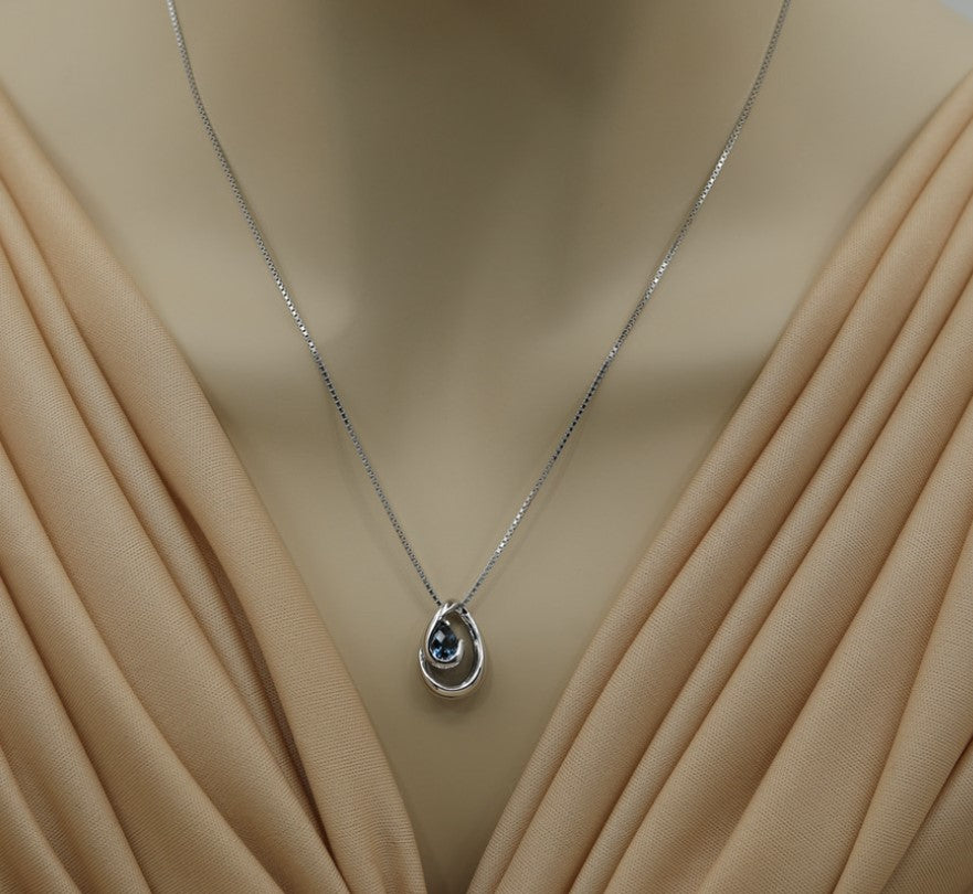 Sterling Silver Rhodium Plated Pendant with One 7mm x 5mm Pear Cut Swiss Blue Topaz. Measures 1/2 Inch by 5/8 Inches. Comes on a Sterling Silver Rhodium Plated 18 Inch 1mm Box Chain.