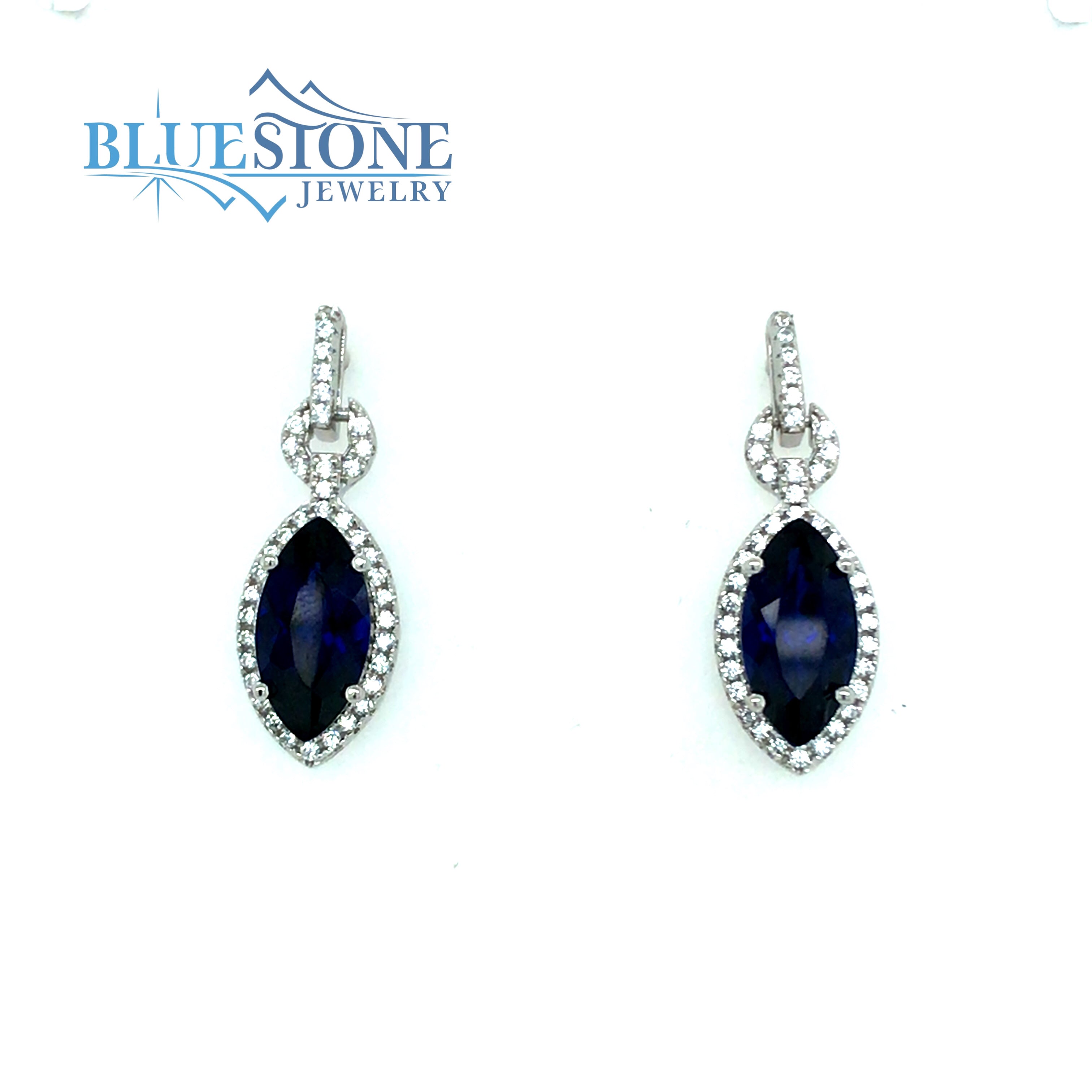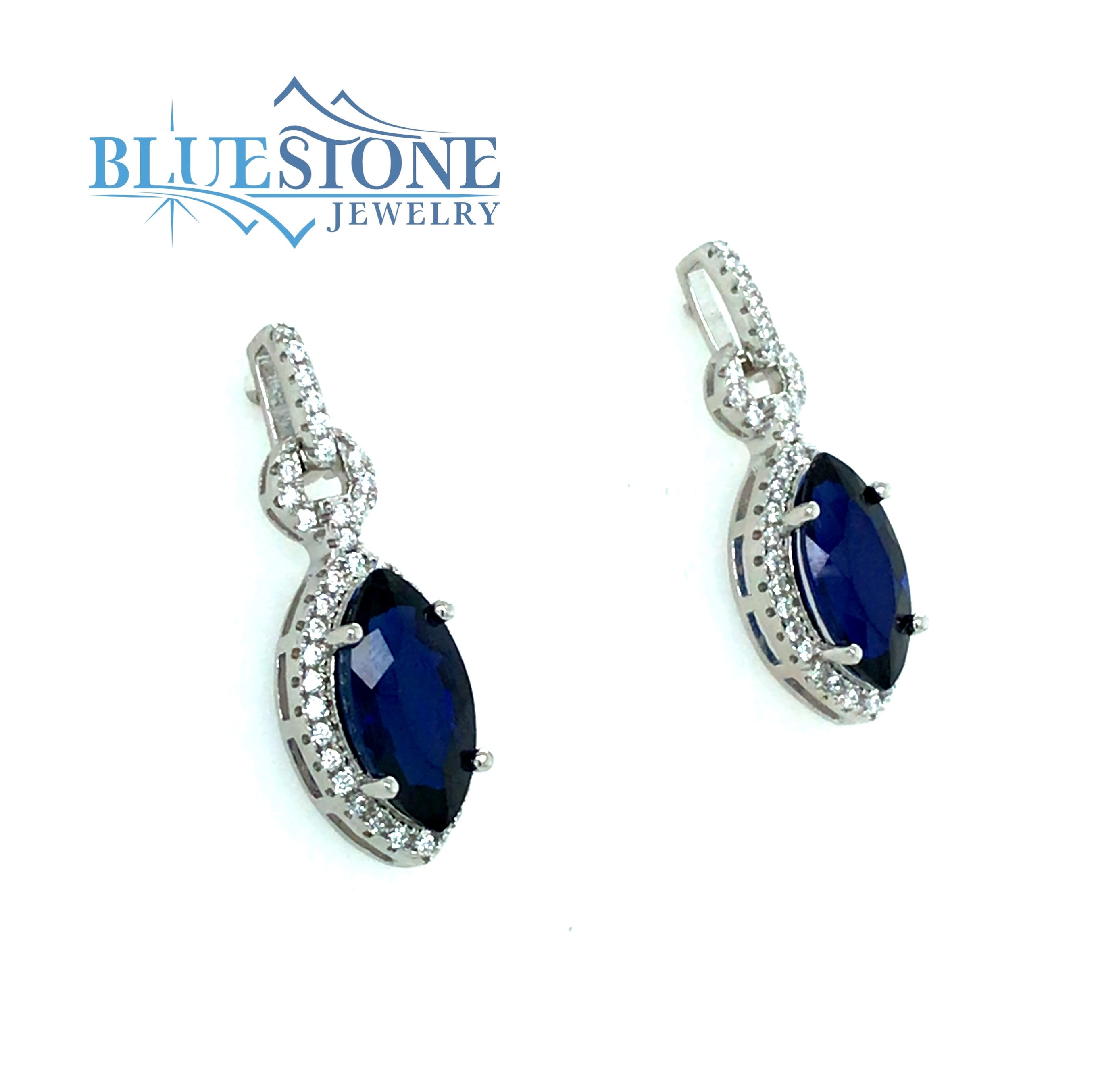 Sterling Silver Rhodium Plated Post Drop Earrings with Two 12mm x 6mm Marquise Cut Created Sapphires and Cubic Zirconias.