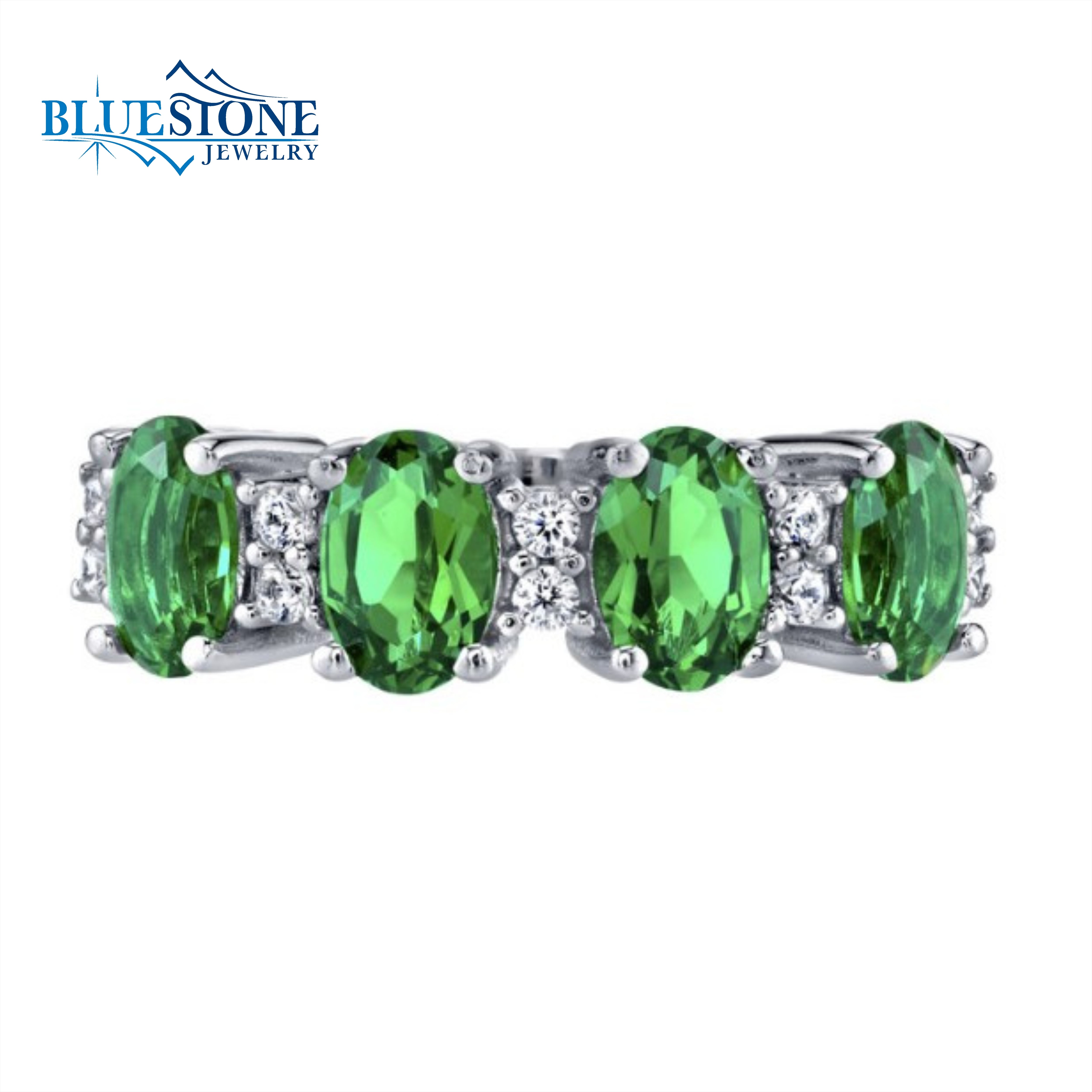 Sterling Silver Rhodium Plated Ring with Four 0.50 Carat 4mm x 6mm Oval Cut Simulated Emeralds and Ten Cubic Zirconias. Ring Size 7.Other Ring Sizes are Available.