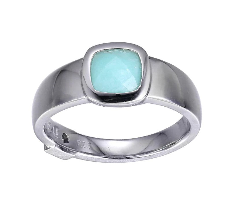Sterling Silver with Rhodium Plating Ring with One 6mm Cushion Cut Amazonite Gemstone. Ring Includes One Hidden Round Created Ruby Which Represents Inner Beauty, Inner Peace & Inner Strength. Ring Size 8.