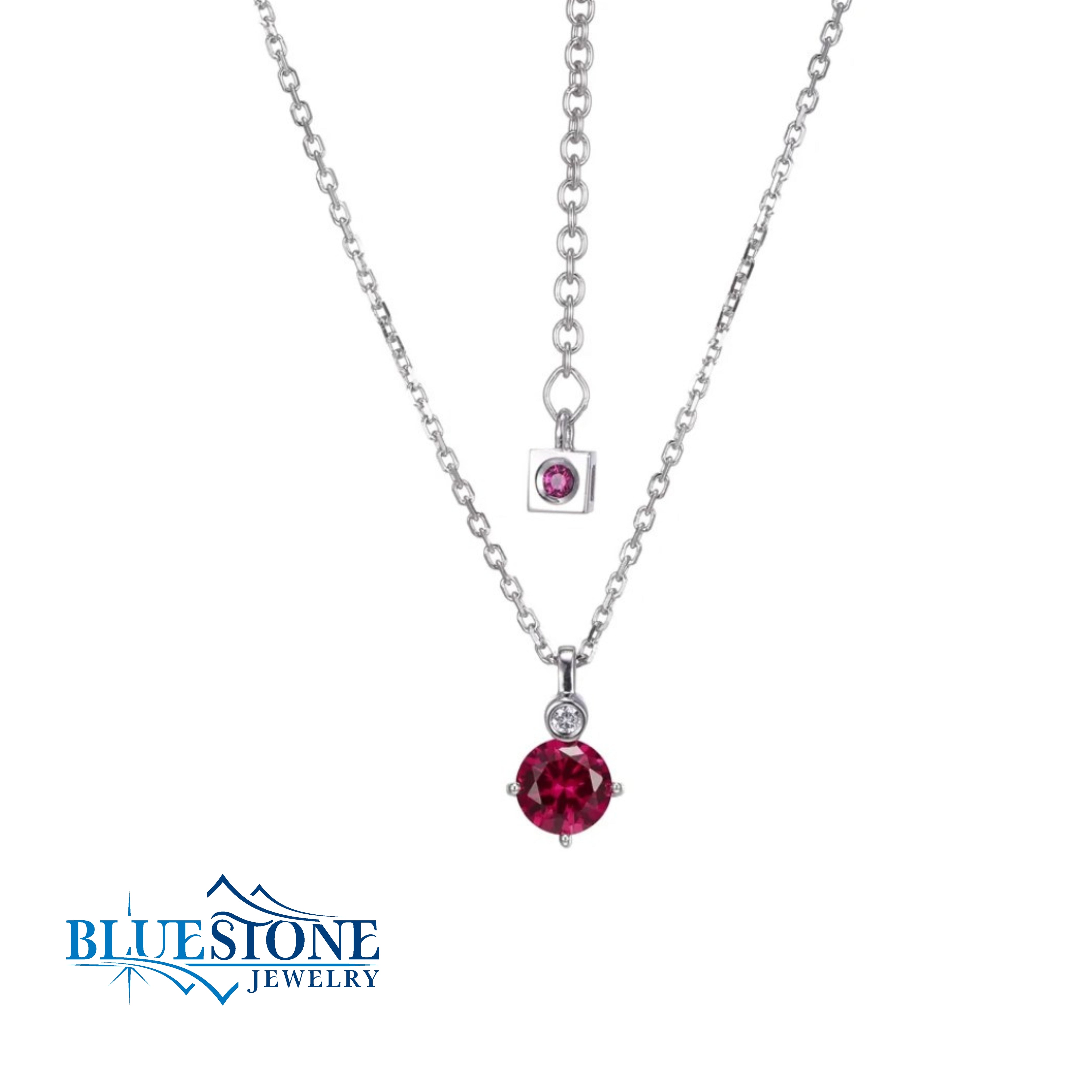 Sterling Silver and Rhodium Plated July Birthstone Pendant with One 6mm Round Created Ruby and One Round Lab Grown Diamond at 0.02 Total Carat Weight. Necklace Includes One Hidden Round Created Ruby Which Represents Inner Beauty, Inner Peace & Inner Strength.Necklace Comes on a 19 Inch, 1.9mm Faceted Crossed Diamond Cut Cable Chain. Chain Can Be Worn at Lengths Between 17 to 19 Inches.