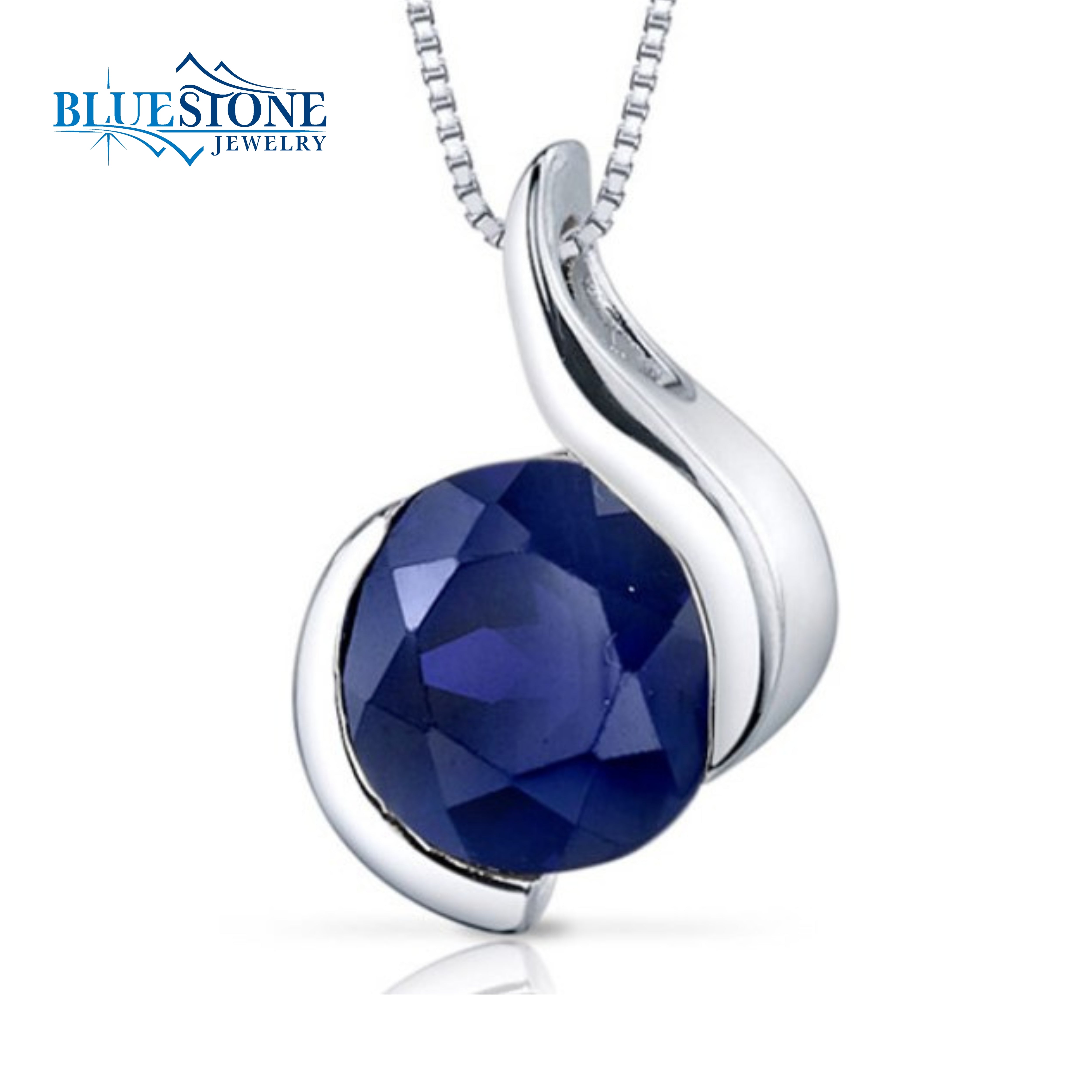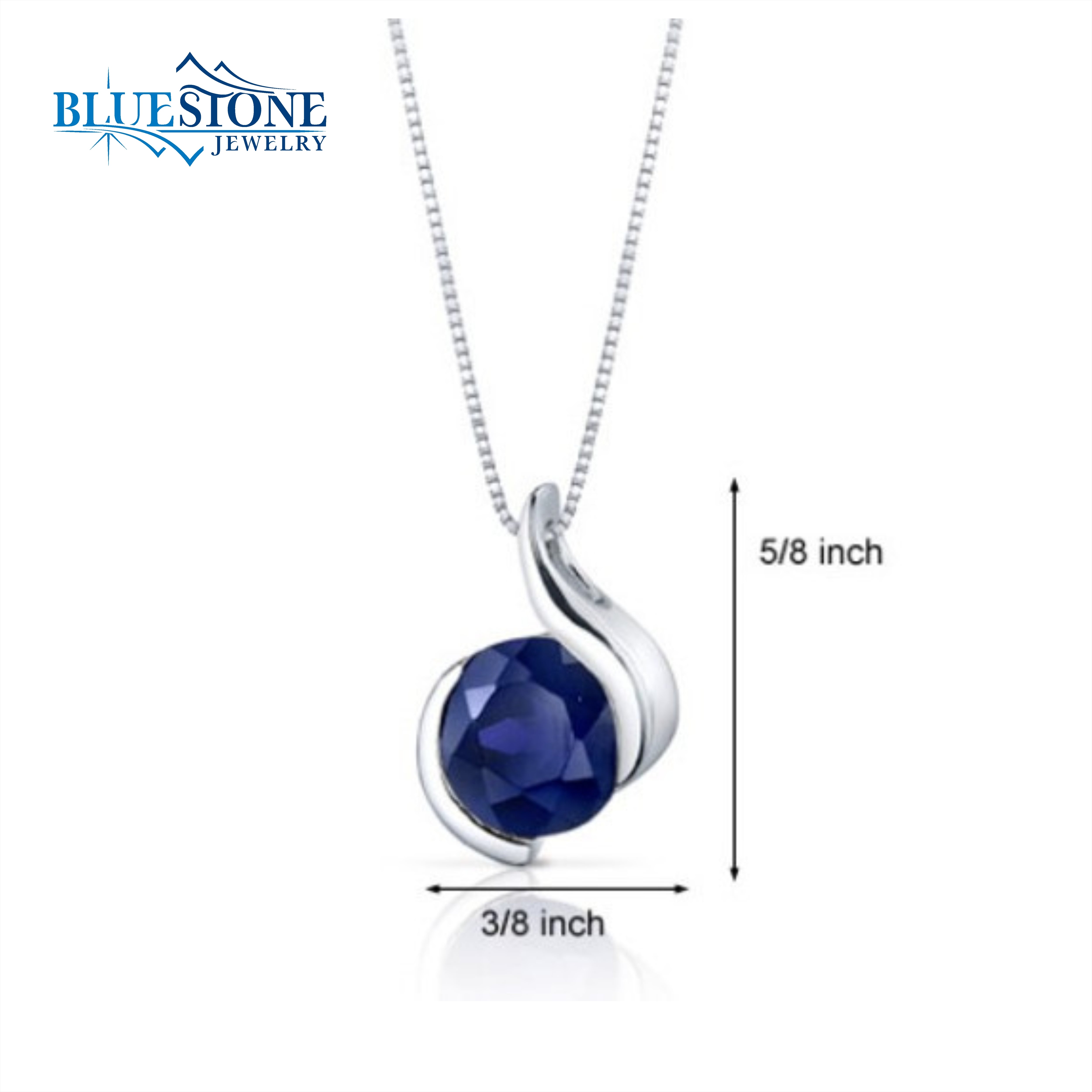 Sterling Silver Rhodium Plated Pendant with One 8mm 2.75 Carat Round Cut Lab Created Sapphire. Pendant Measures 5/8 Long. Comes on a Sterling Silver Rhodium Plated 16 Inch 1mm Box Chain.