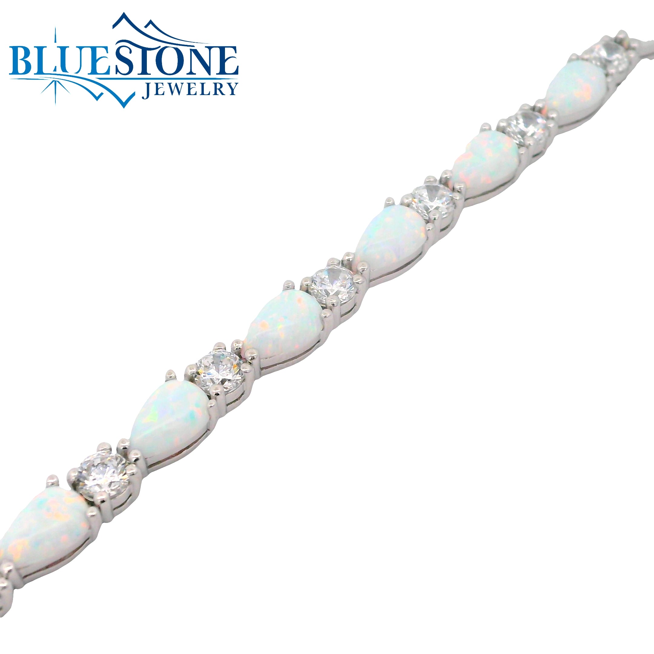 Sterling Silver Rhodium Plated Tennis Bracelet with 14 Pear Cut Lab Created White Opals and 14 4mm Round Cut Cubic Zirconias. Bracelet Measures 7.5".