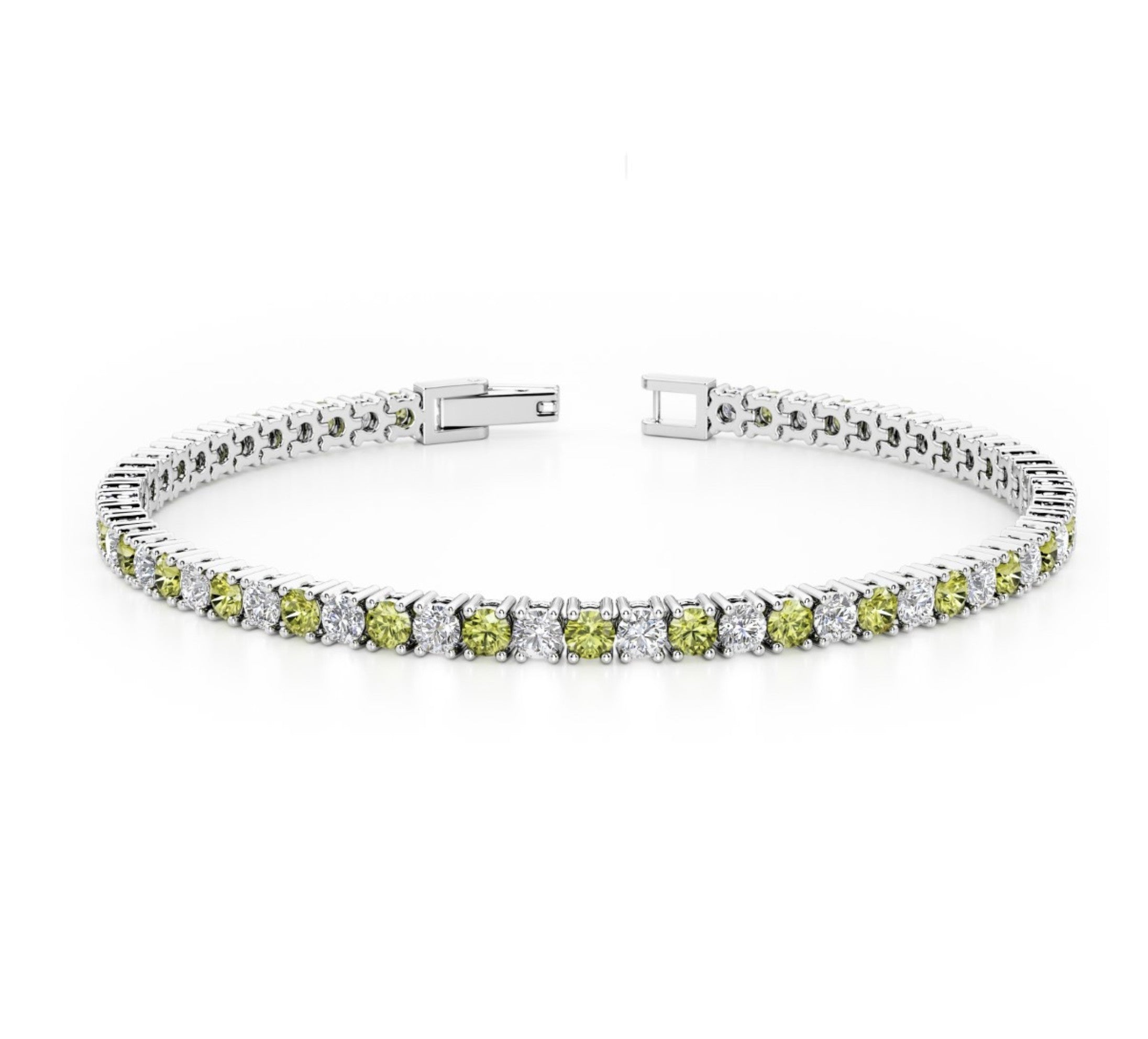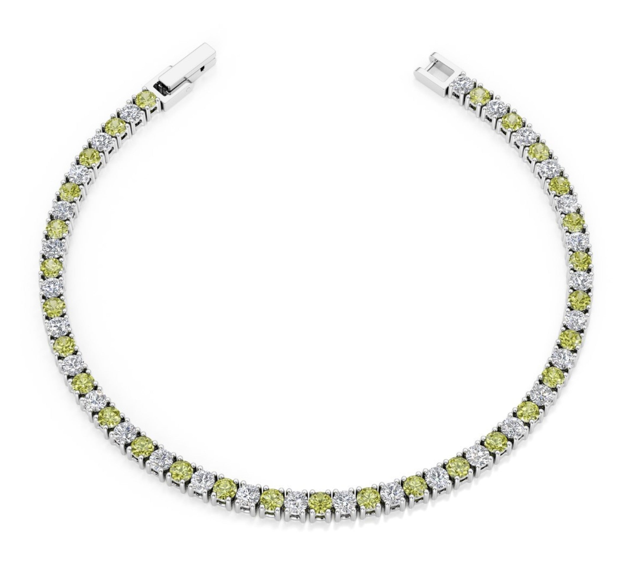 Sterling Silver Rhodium Plated Tennis Bracelet with 29 Round 3mm Round Peridot and 29 Round Cut 3mm Cubic Zirconias. Bracelet Measures 7.5".